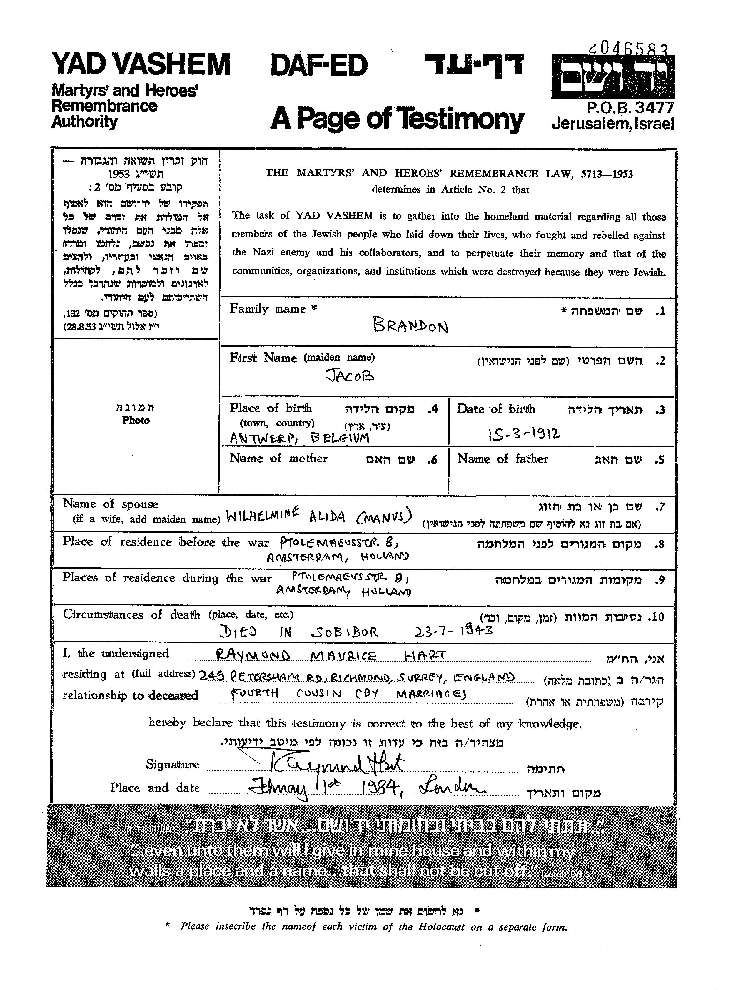 Yaakov Brandon est né à Antwerpen, Belgique en 1912. Avant la seconde guerre mondiale il vivait à Amsterdam, Pays-Bas.