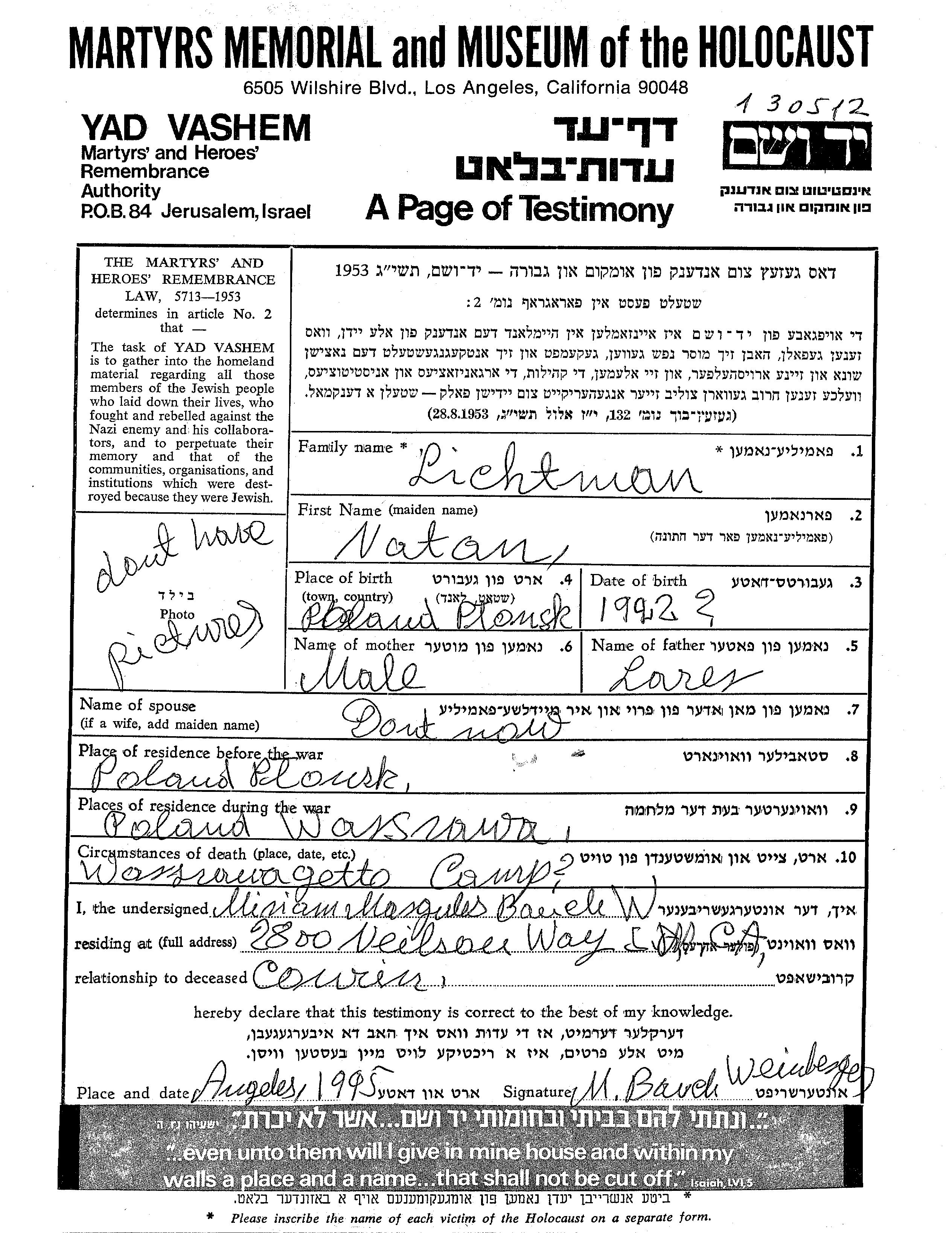 Lichtman | Natan | 1918 | Plonsk, Pologne | Feuille de témoignage |