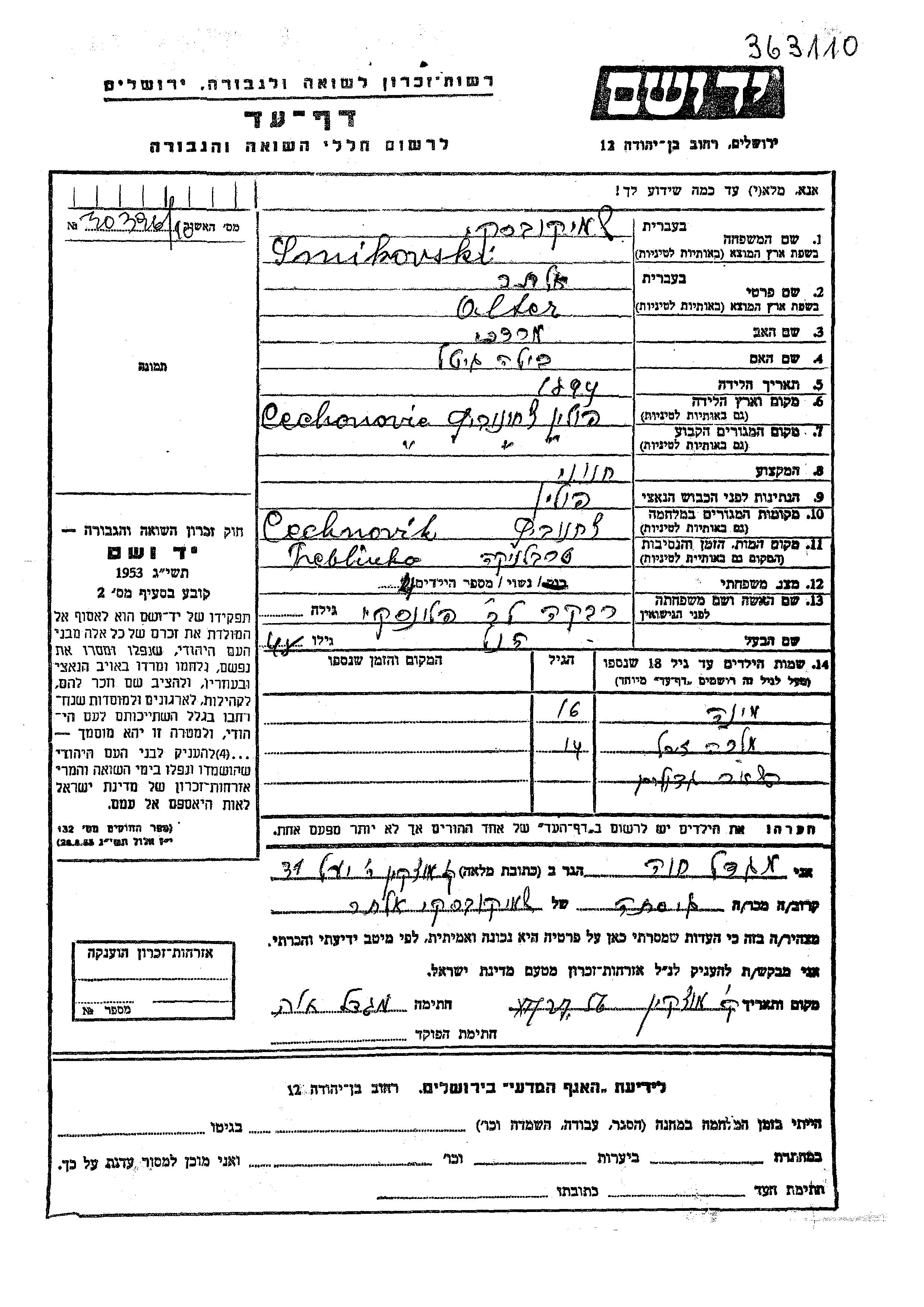 Smikovski Mina Ciechanoviec, Pologne Feuille de témoignage