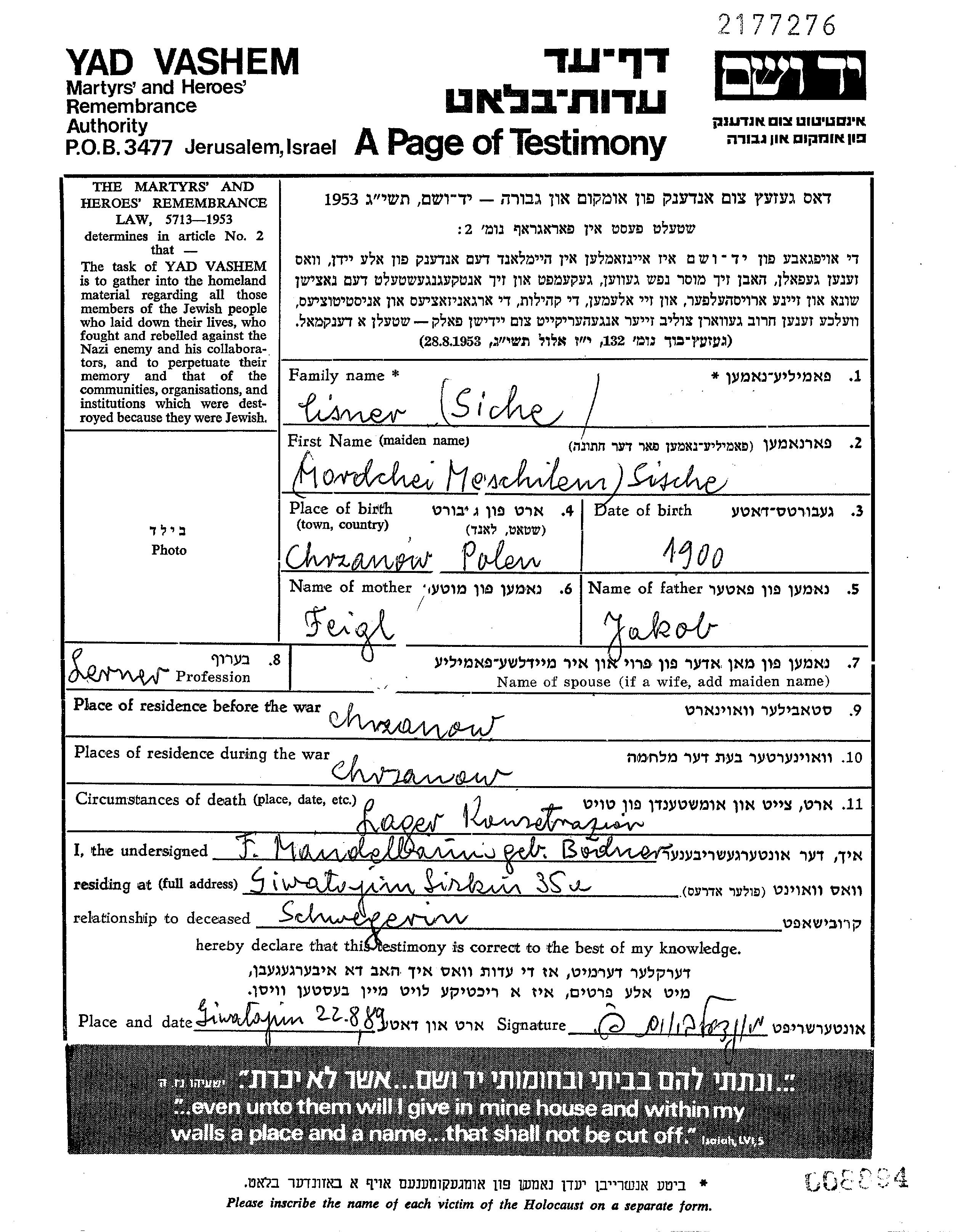 Cisner Mordchei Sische 1900 Chrzanow, Pologne Feuille de témoignage