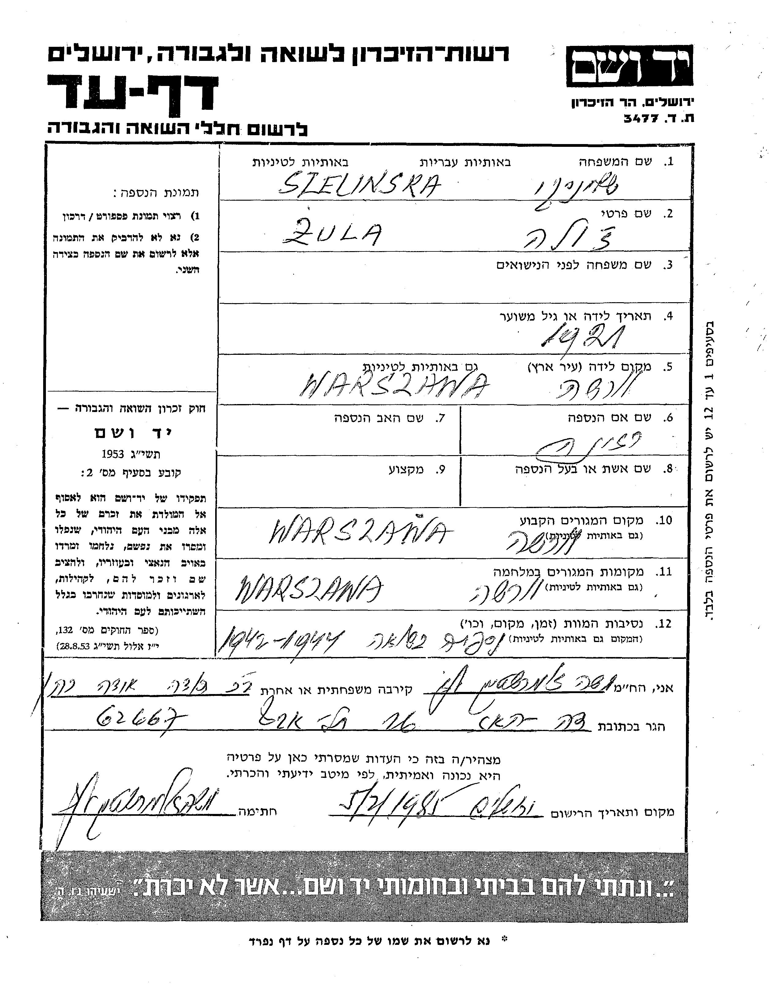 Szelinska Shlonski Zula Zhula 1921 Warszawa, Pologne Feuille de témoignage