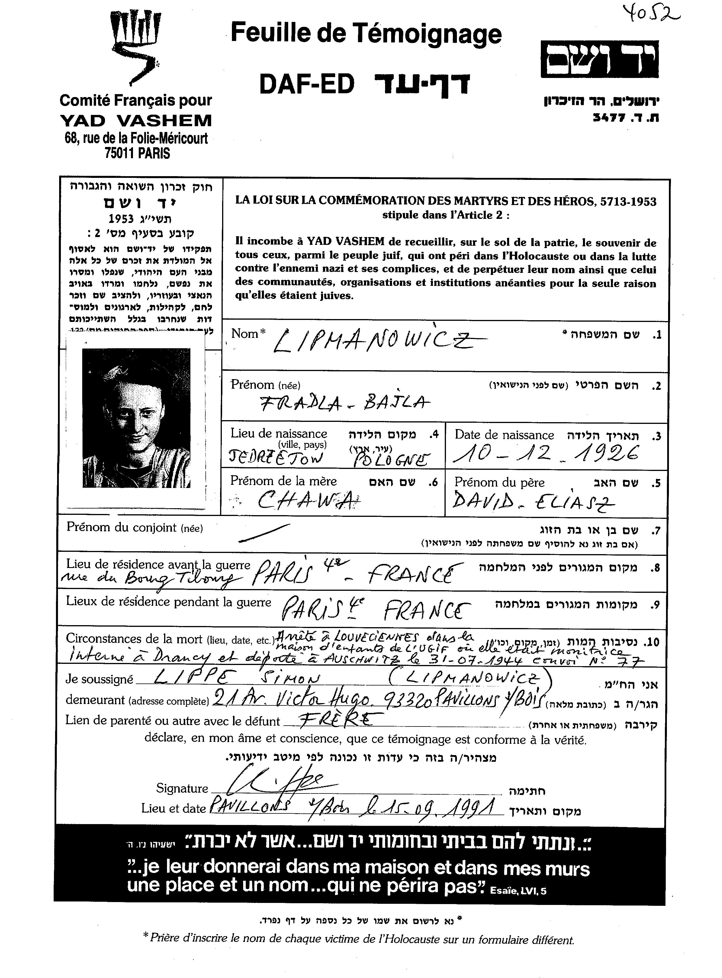 Lipmanowicz Fradla Bajla 1926 Paris, France Feuille de témoignage