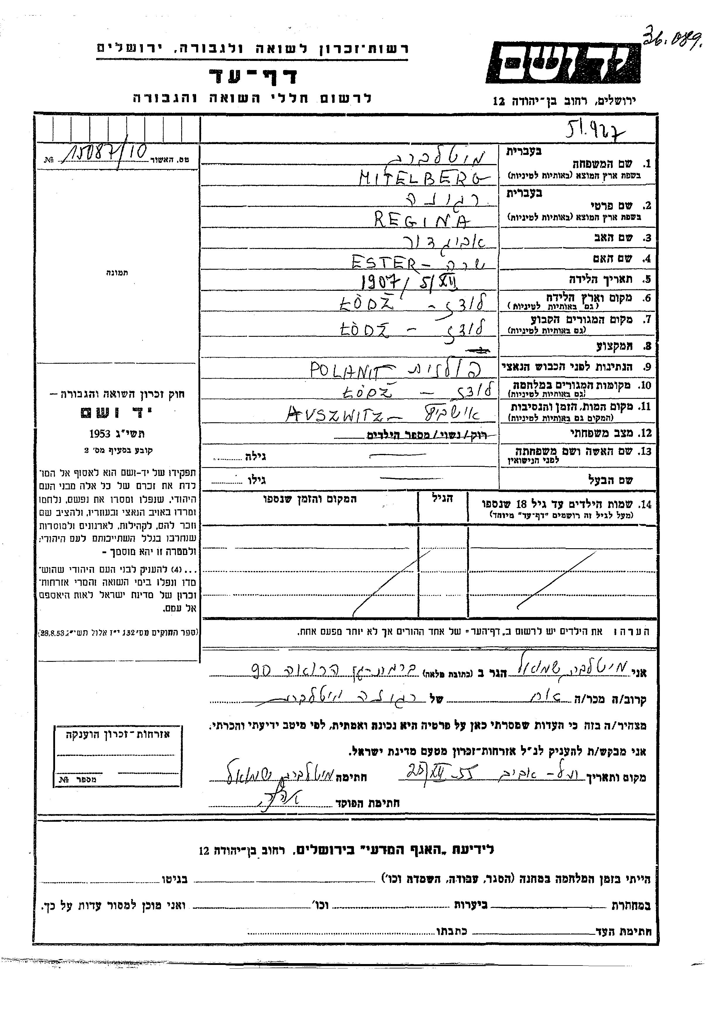 Mitelberg Regina 1907 Lodz, Pologne Feuille de témoignage