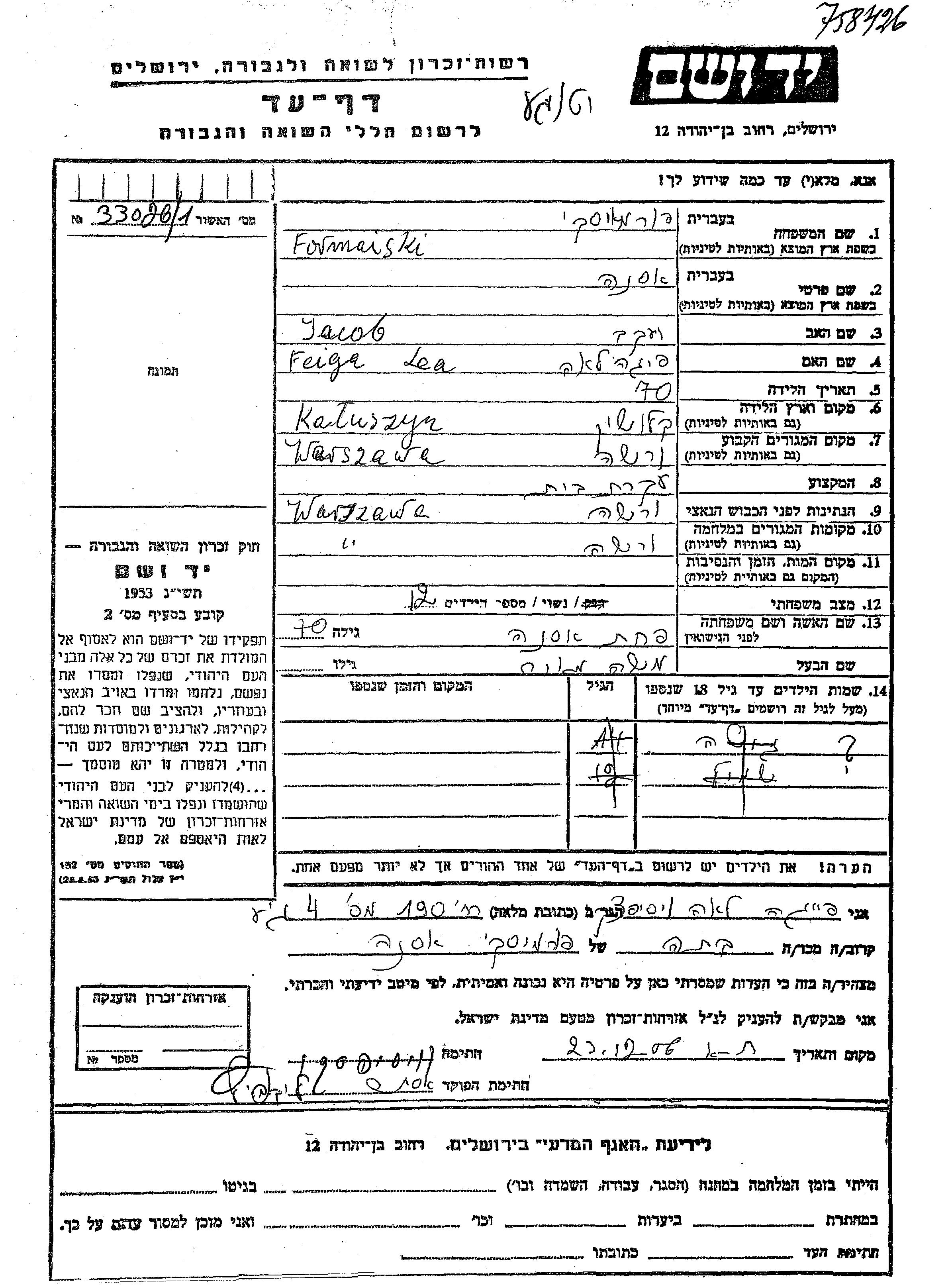 Shmil Formaiski. Avant la seconde guerre mondiale il vivait à Warszawa, Pologne.