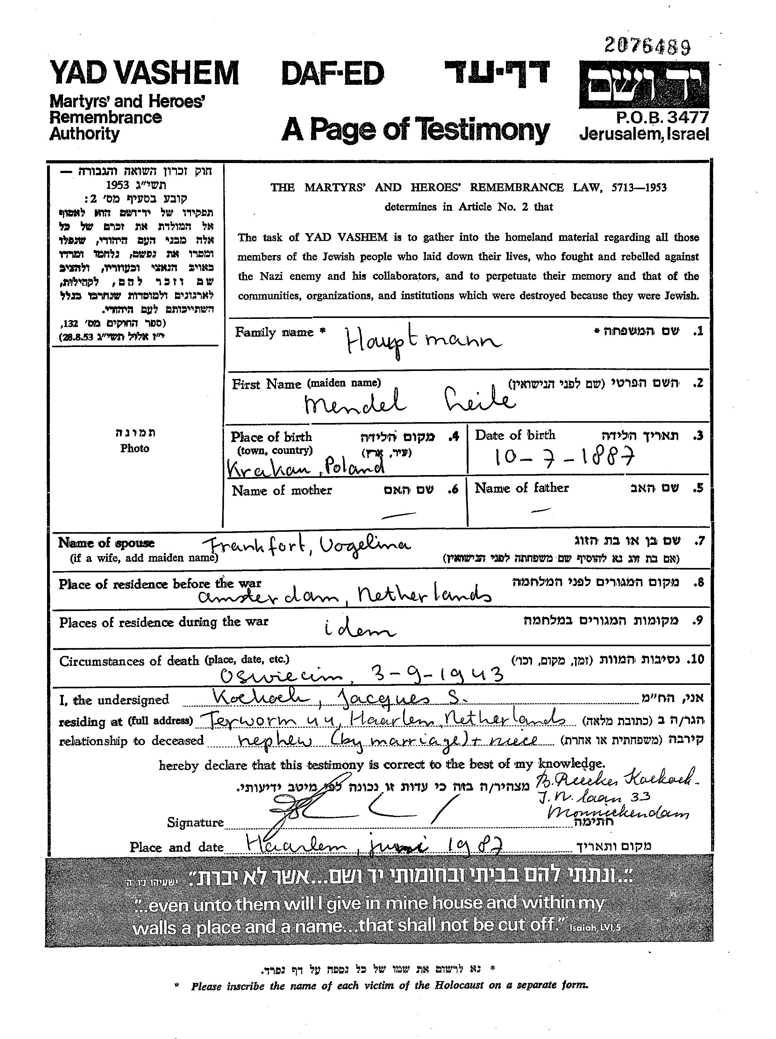 Leib Mendel Hauptmann est né à Krakow, Pologne en 1887. Avant la seconde guerre mondiale il vivait à Amsterdam, Pays-Bas.