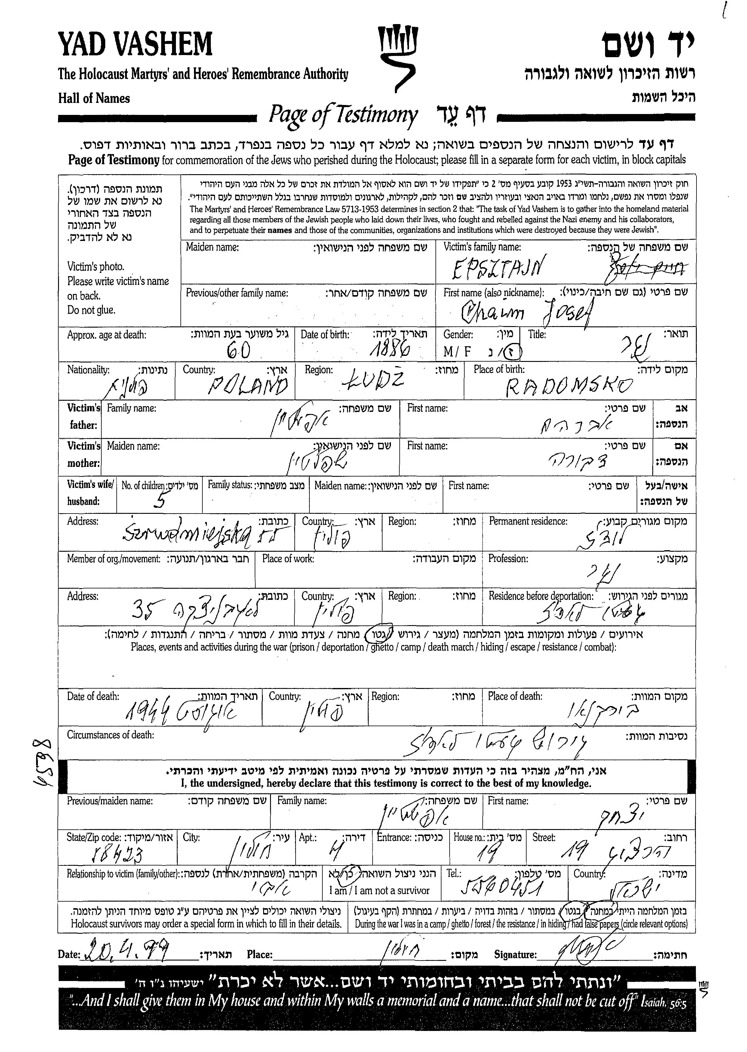 Epsztajn Chaim Josef 1886 Lodz, Pologne Feuille de témoignage