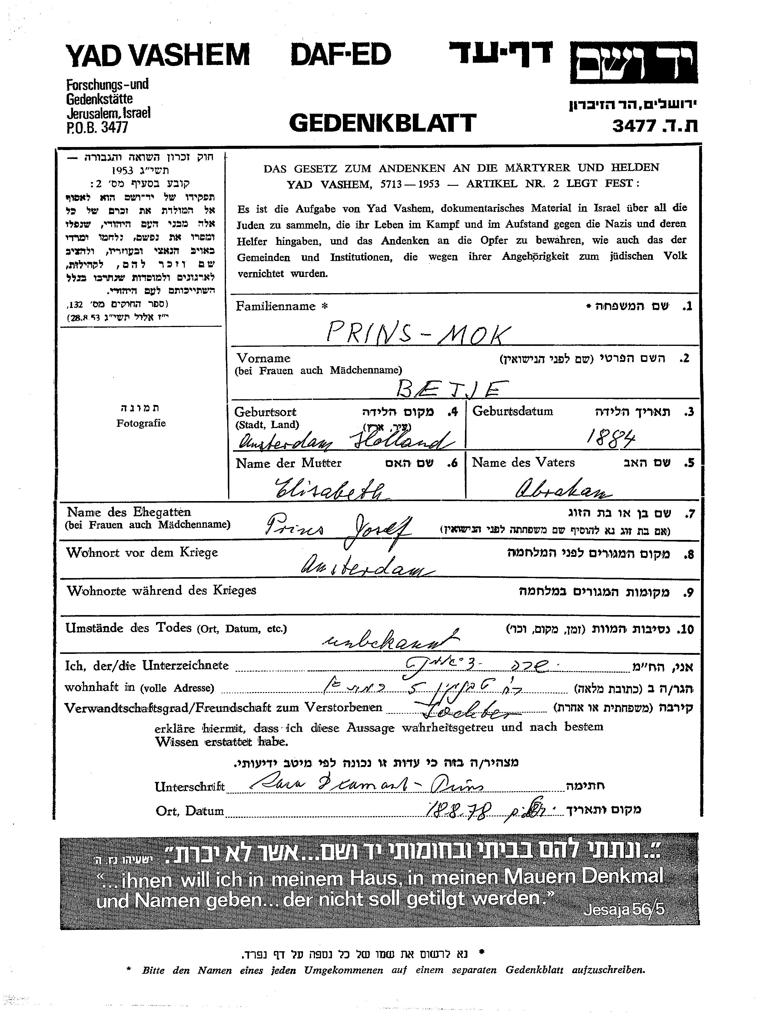 Betje Beila Prins née Mok est née à Amsterdam, Pays-Bas en 1884. Avant la seconde guerre mondiale elle vivait à Amsterdam, Pays-Bas.