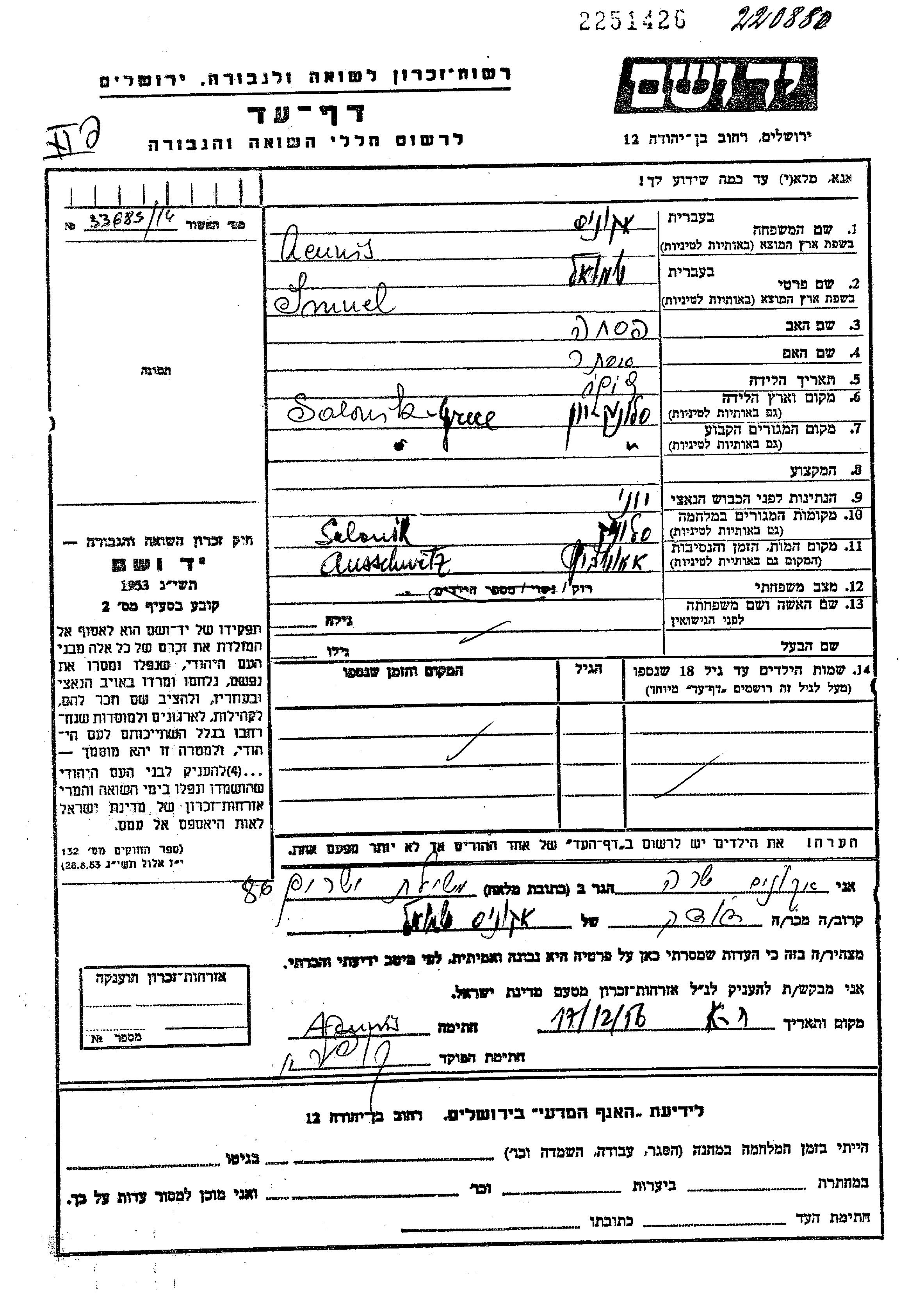 Acunis Smuel 1919 Saloniki, Grèce Feuille de témoignage