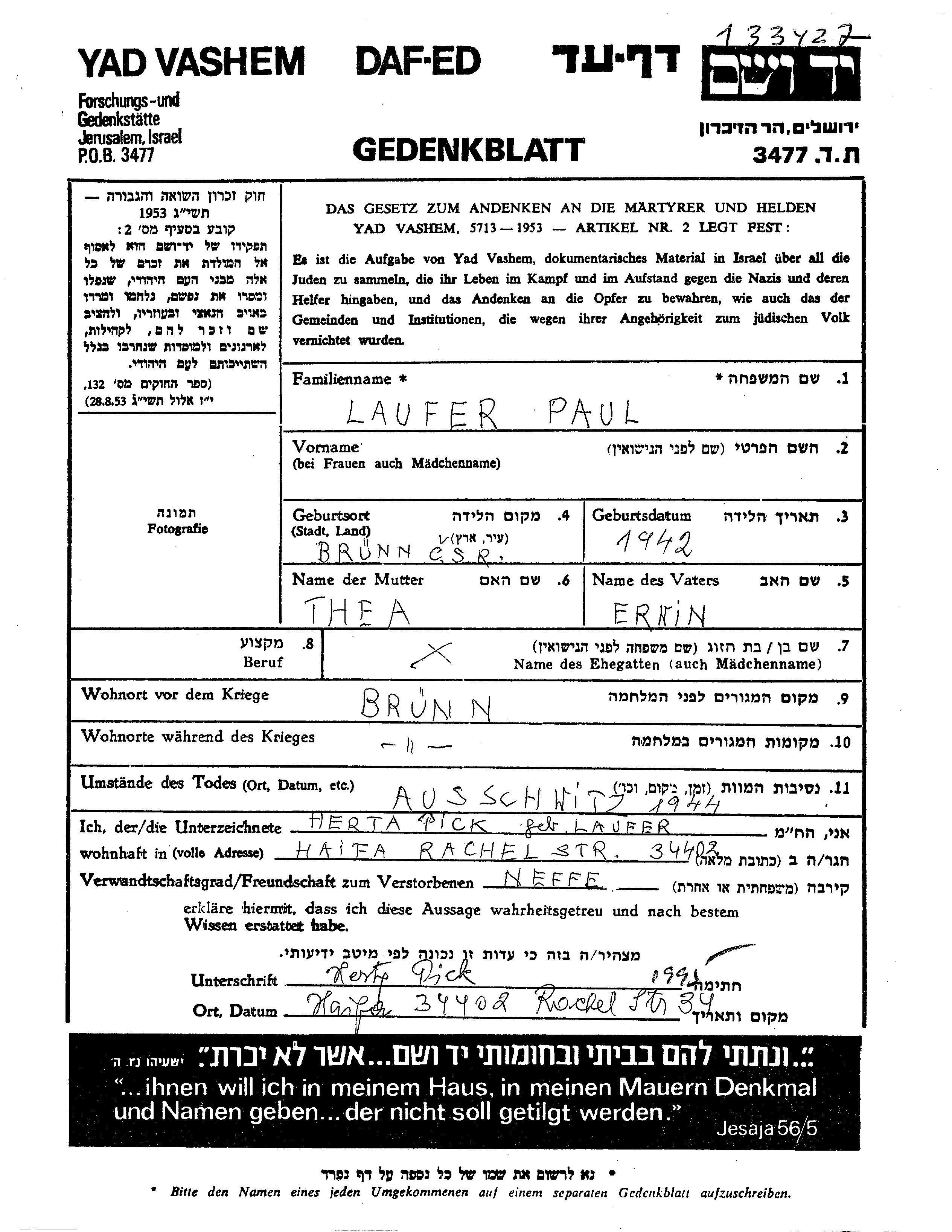 Laufer Paul 1942 Bruenn, Tchécoslovaquie Feuille de témoignage
