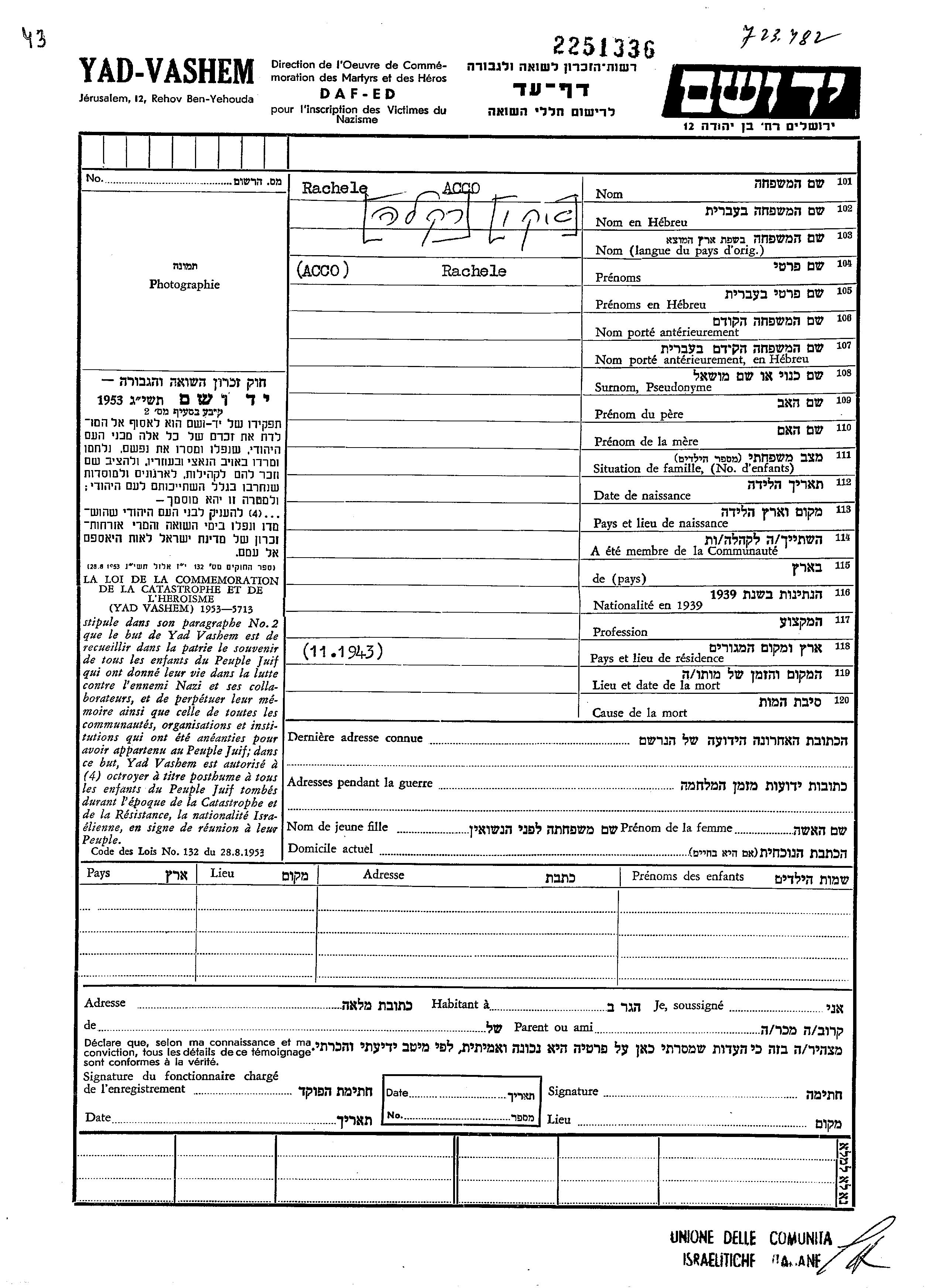 Acco Rachele Rikla endroit inconnu, Feuille de témoignage