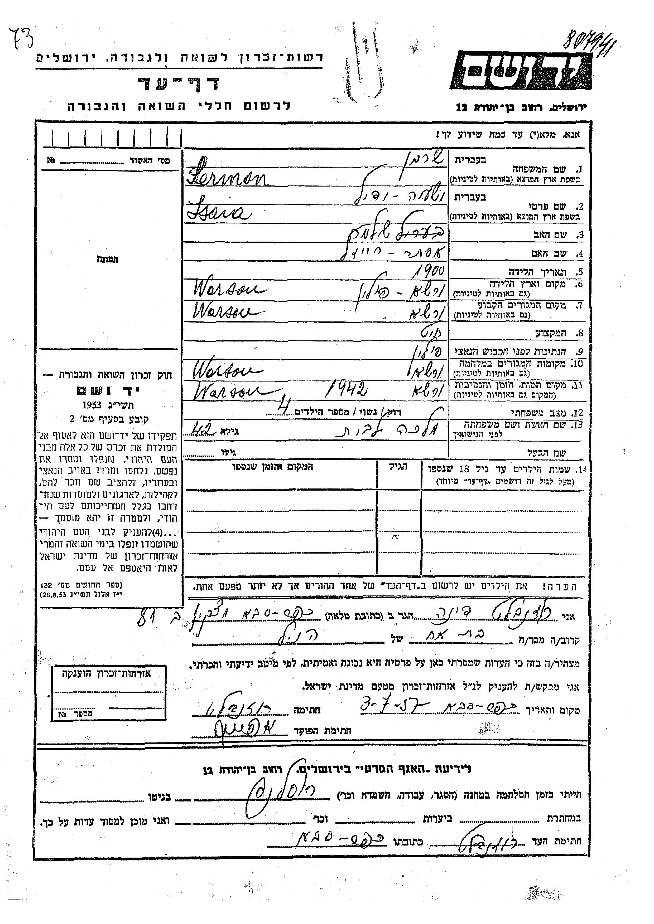 | Serman Sherman | Ysac Idil Yeshiyah | 1900 | Warsaw, Pologne | Feuille de témoignage |
