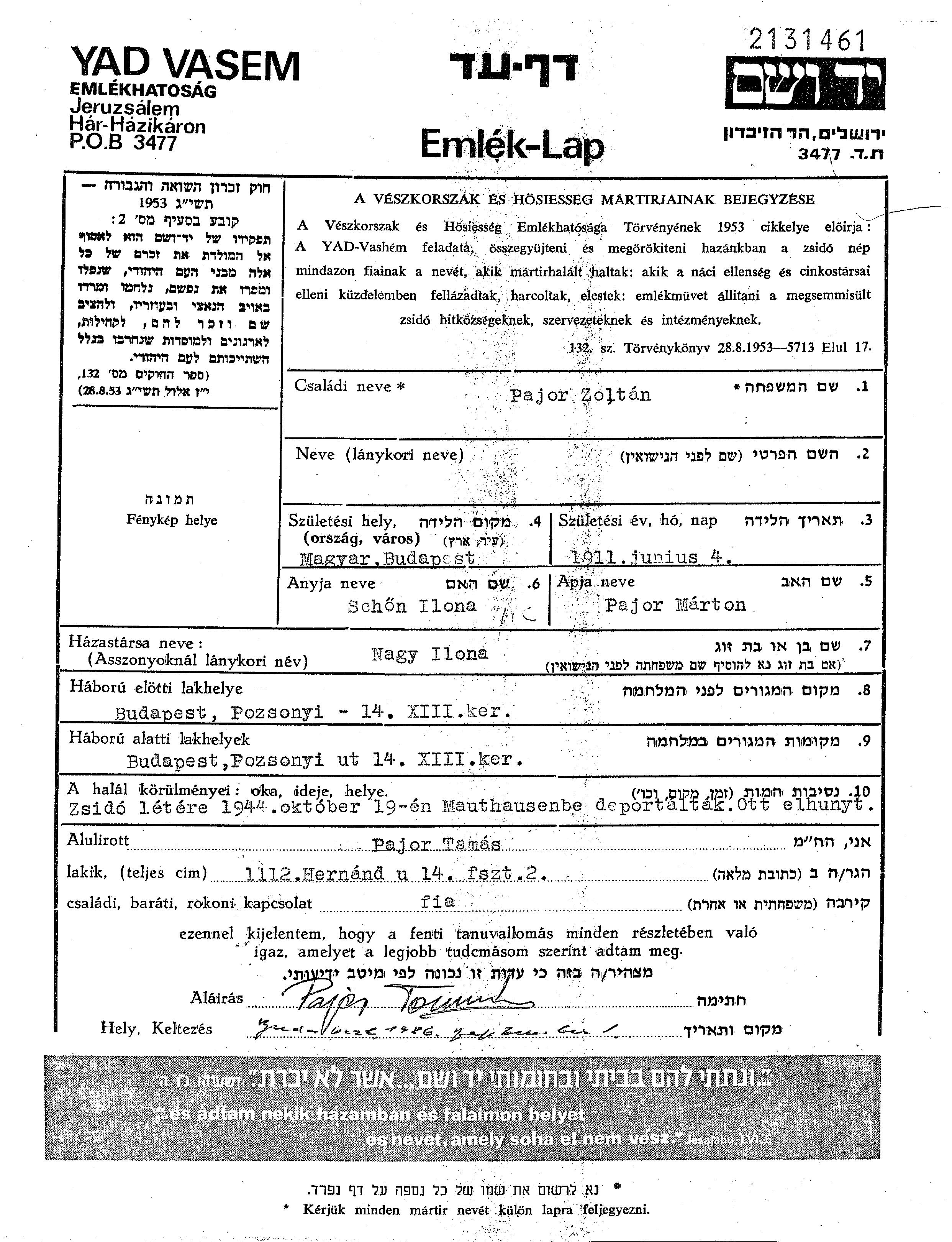 Pajor | Zoltan | 1911 | Budapest, Hongrie | Feuille de témoignage |