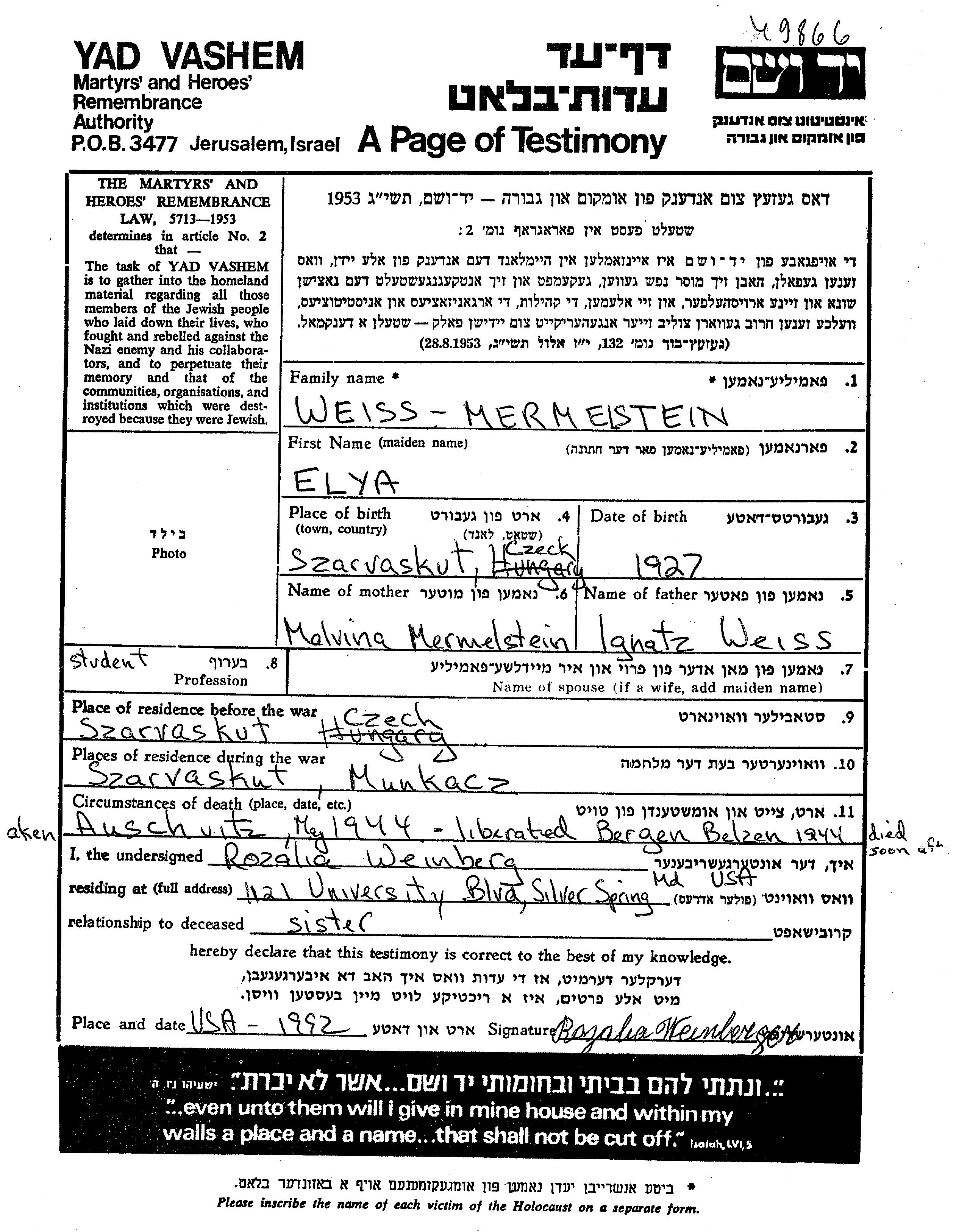 Weiss Mermelstein Elya Alia 1927 Szarvaskut, Tchécoslovaquie Feuille de témoignage