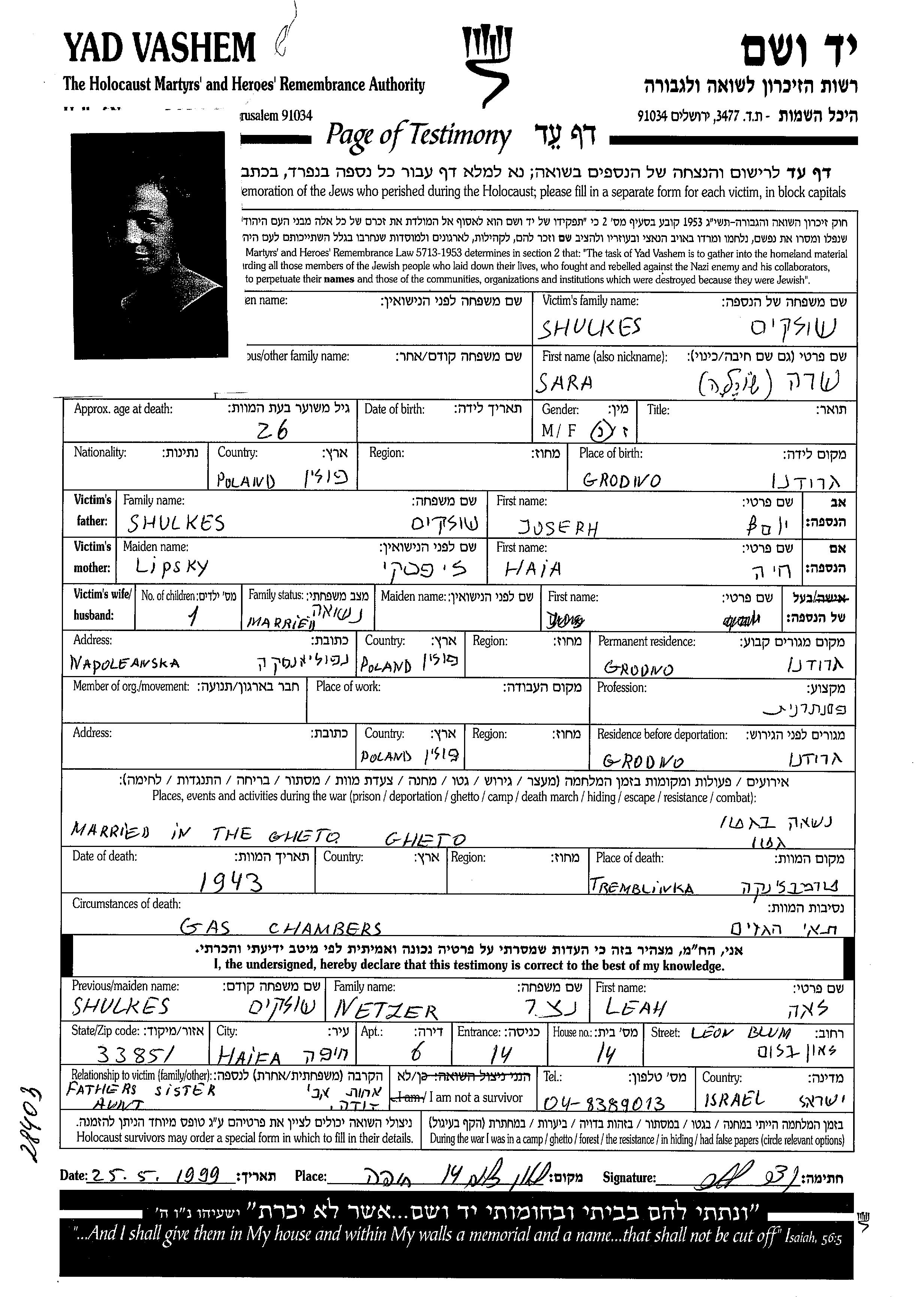 Shulkes | Sara | Grodno, Pologne | Feuille de témoignage | |