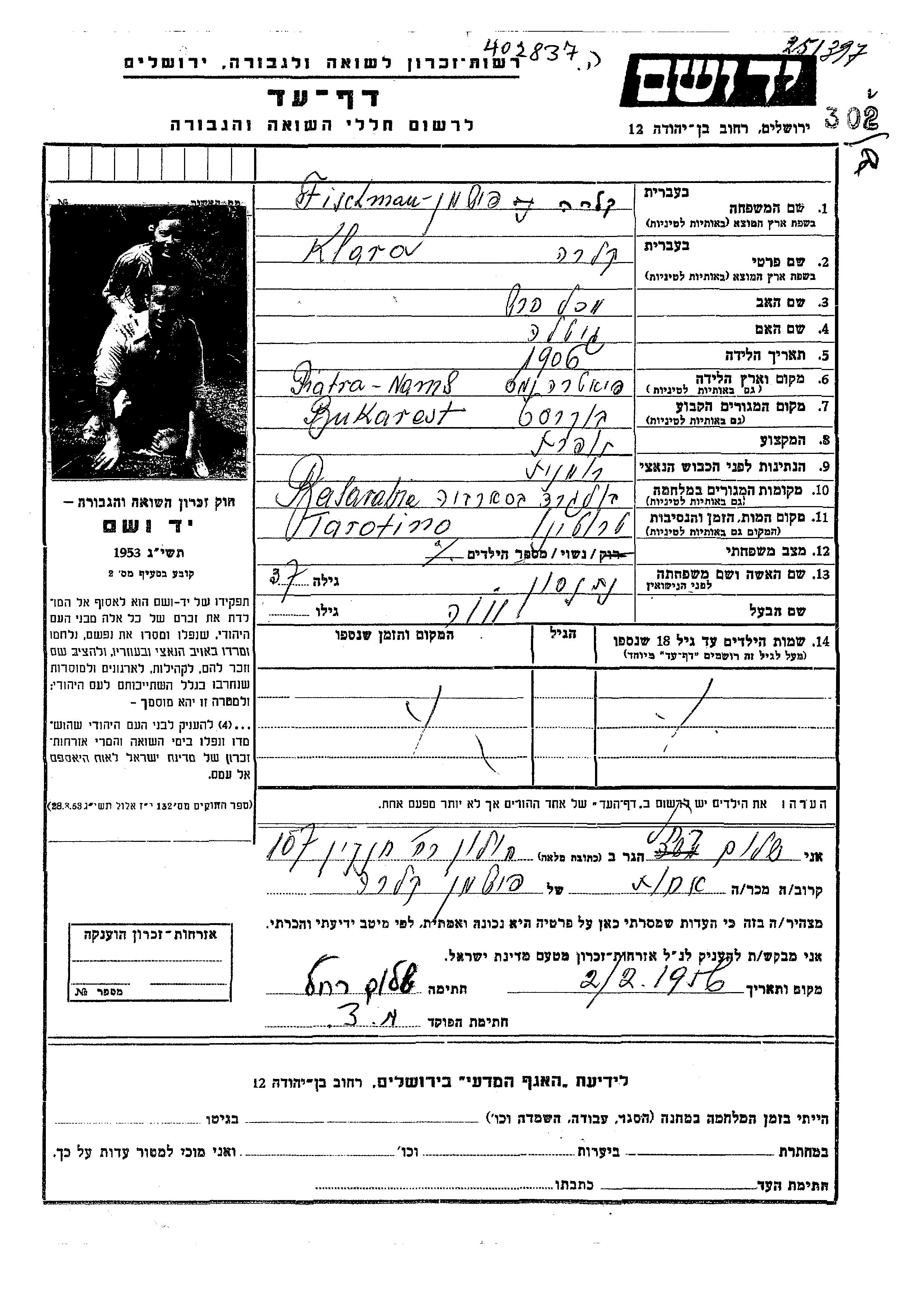 Fischman Klara 1906 Bukarest, Roumanie Feuille de témoignage