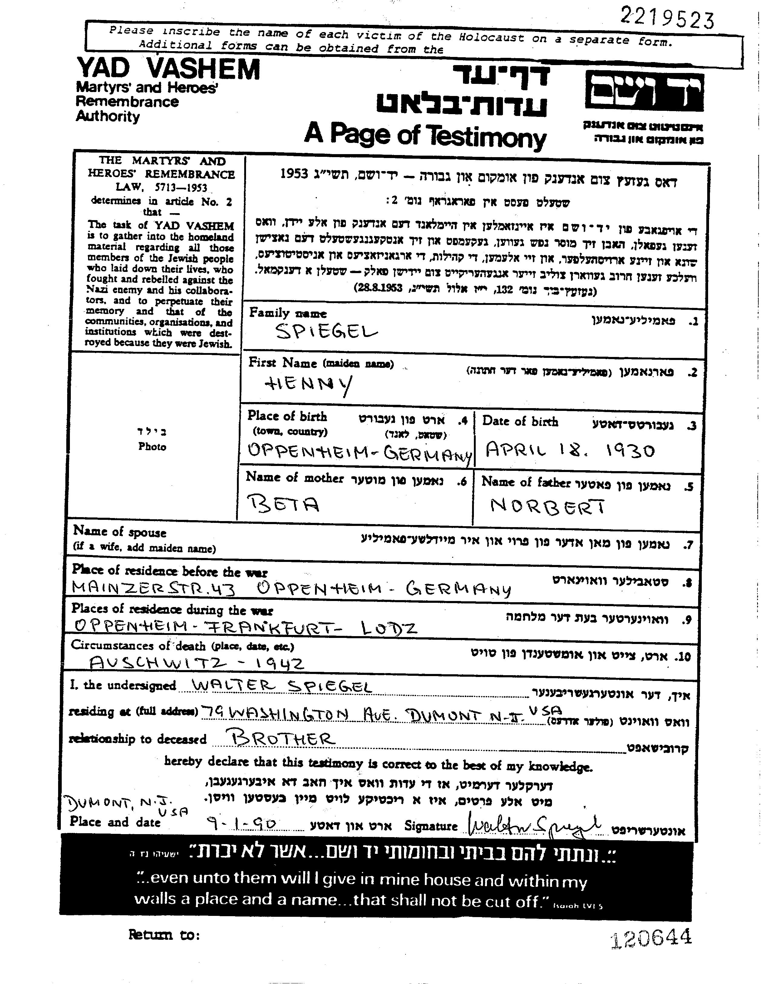 Henni Henny Spiegel est née à Oppenheim, Allemagne en 1930. Elle était Élève. Avant la seconde guerre mondiale elle vivait à Oppenheim, Allemagne.