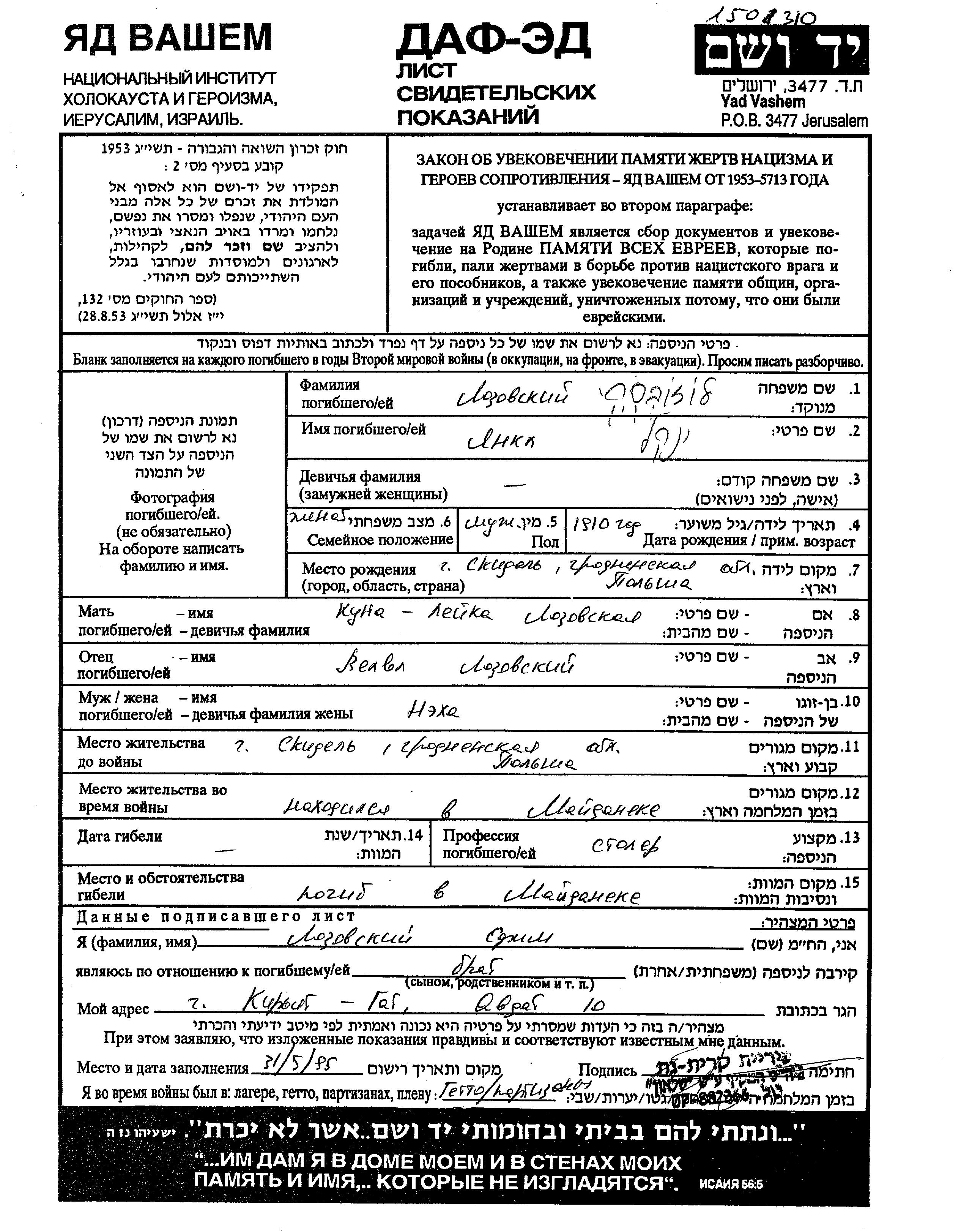 Lozovski Yankl 1910 Skidel, Pologne Feuille de témoignage