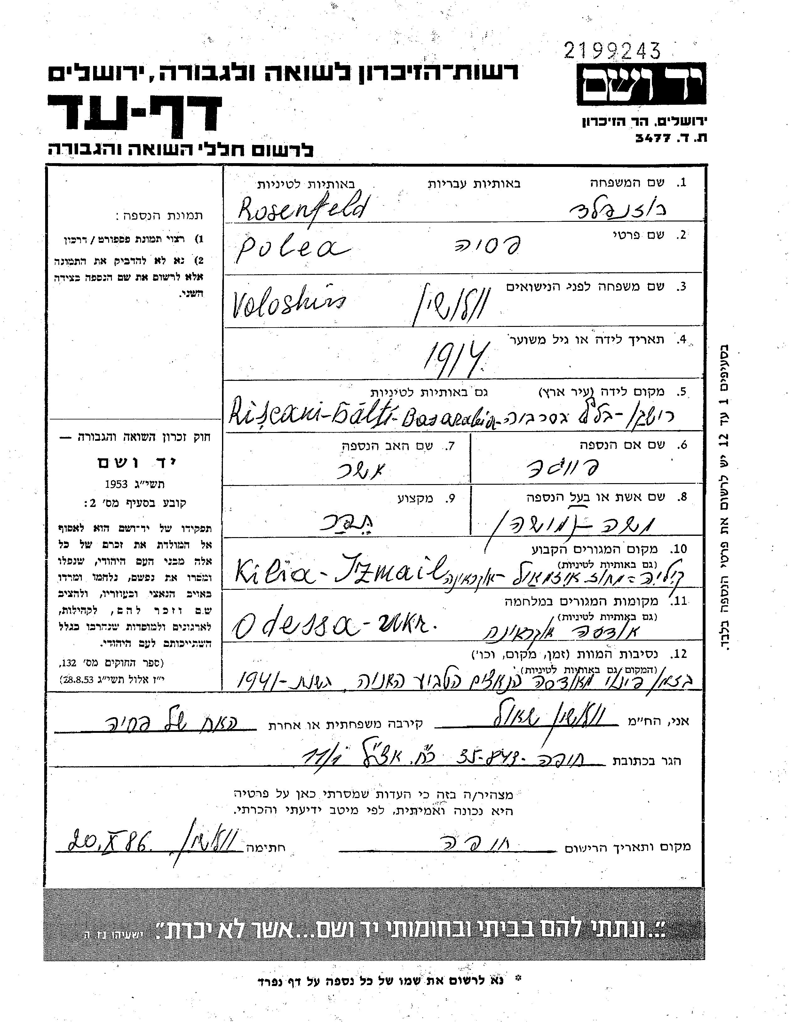 Polea Pesia Rosenfeld Volosin née Voloshin est née à Rascani, Roumanie en 1914. Elle était Couturière. Avant la seconde guerre mondiale elle vivait à Chilia Noua, Roumanie.