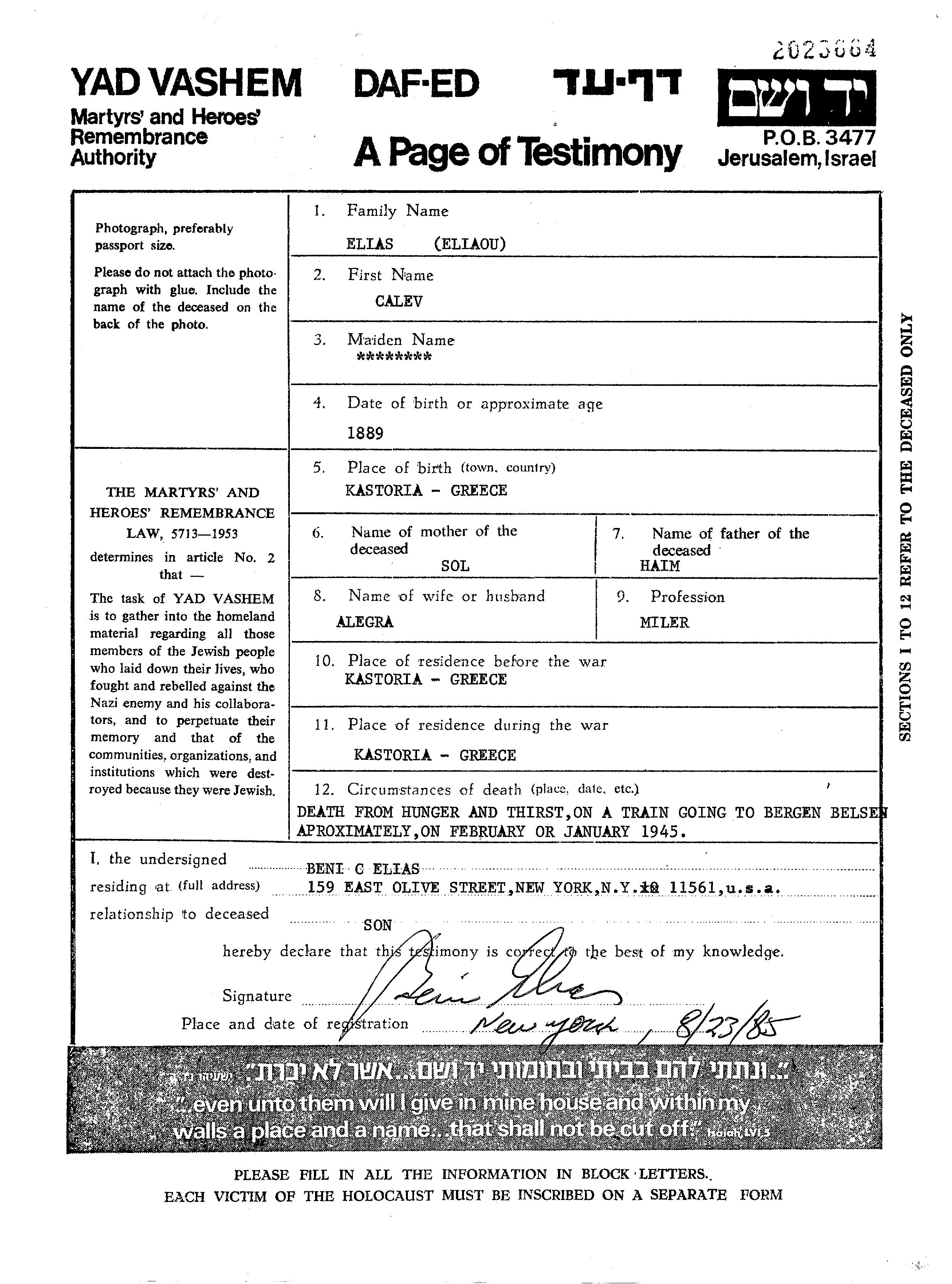 | Eliaou Elias | Calev | Kastoria, Grèce | Feuille de témoignage |
