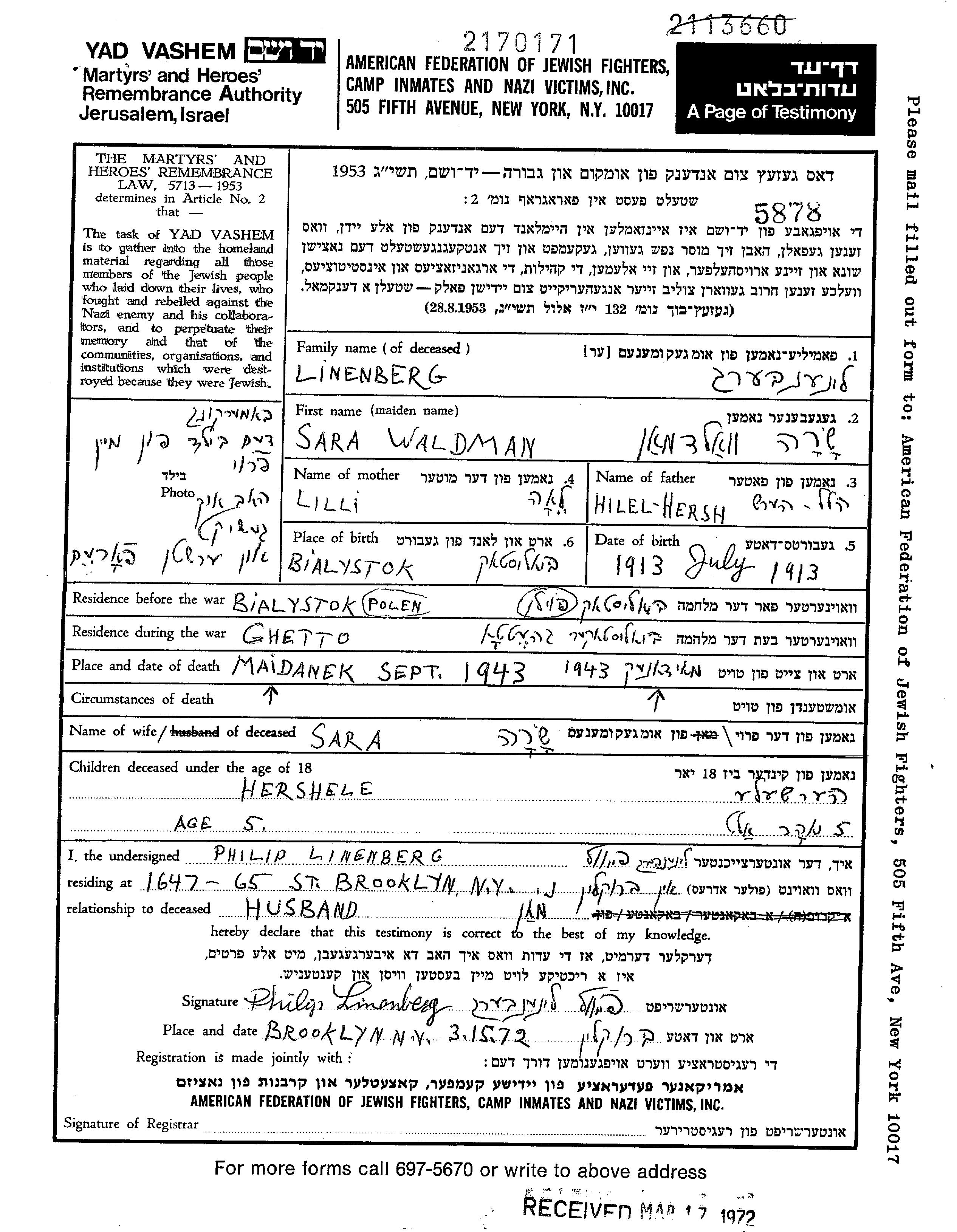 Linenberg Sara 1913 Bialystok, Pologne Feuille de témoignage