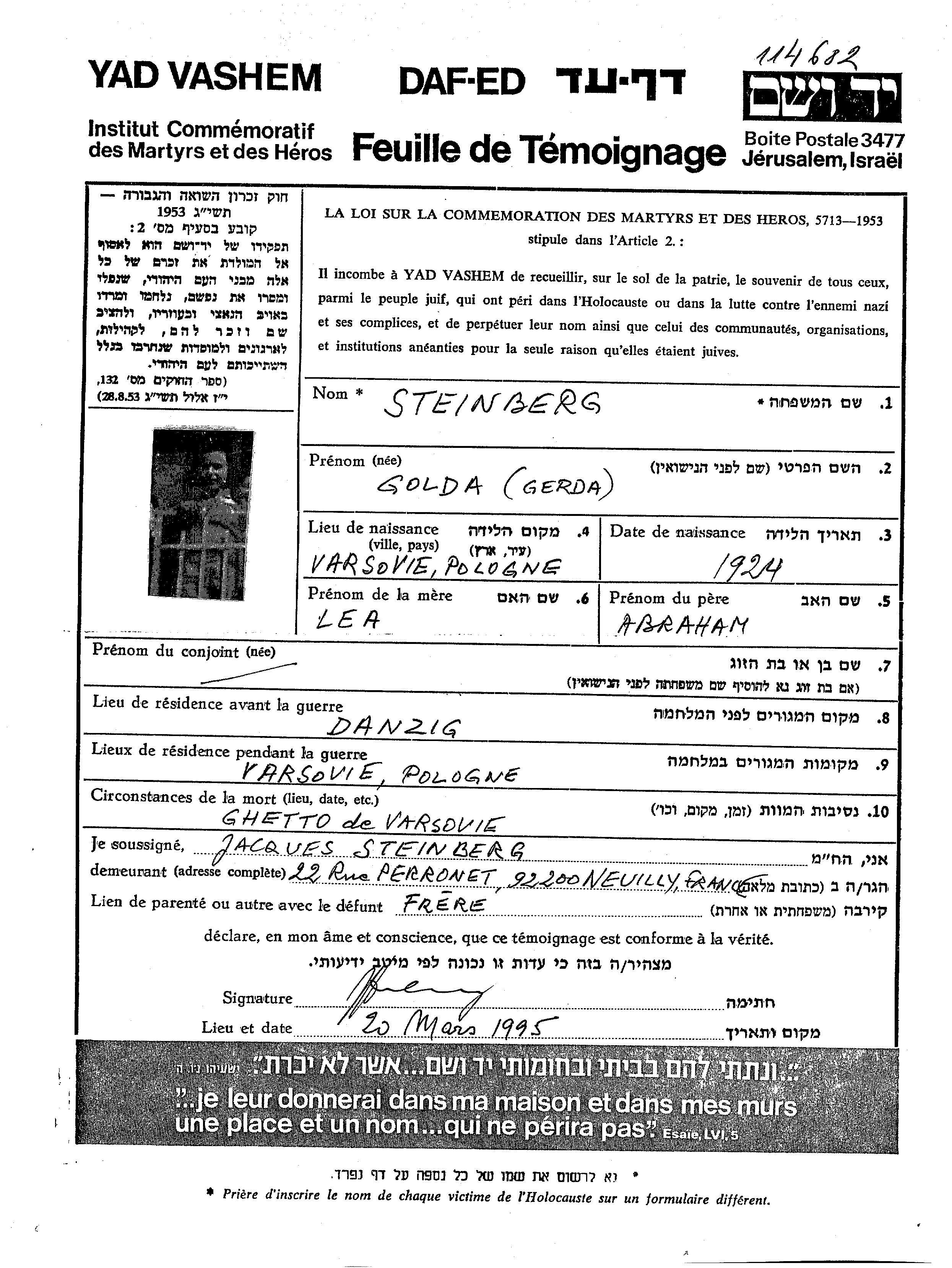 | Steinberg | Golda Gerda | 1924 | Danzig, Ville Franche de Danzig | Feuille de témoignage |