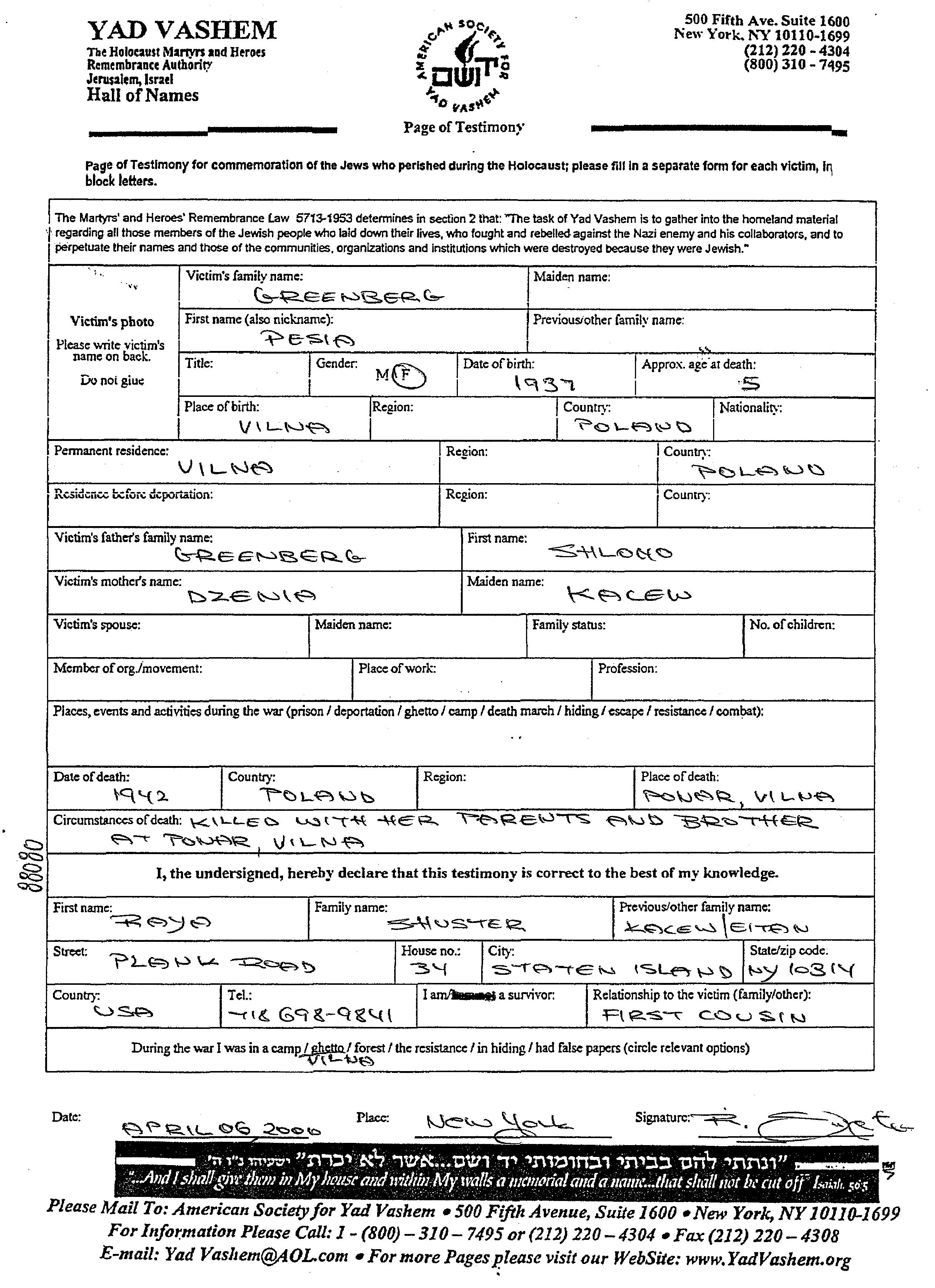 Greenberg Pesia Wilno, Pologne Feuille de témoignage