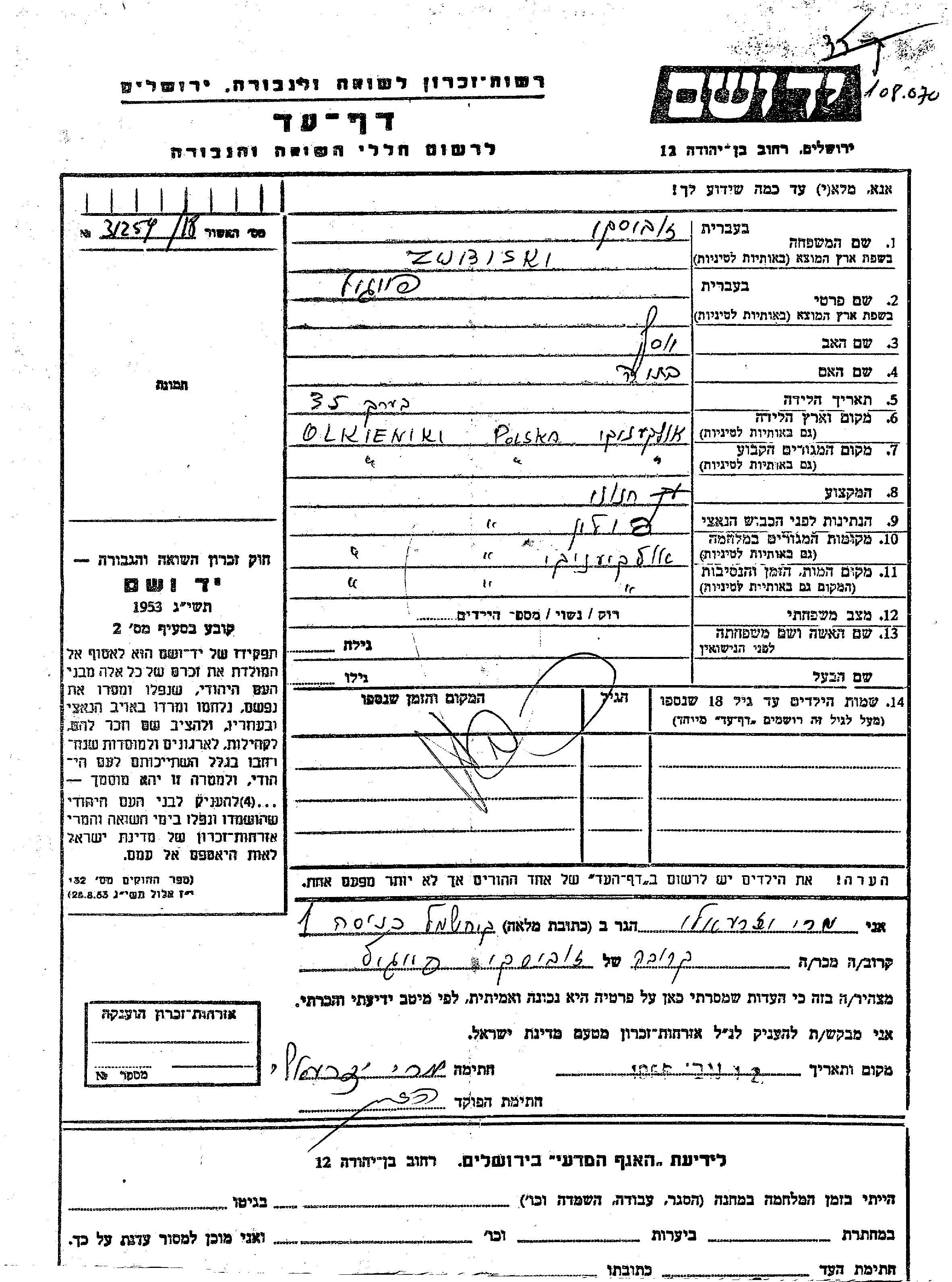 Zubiski Tzipora Olkieniki, Pologne Feuille de témoignage