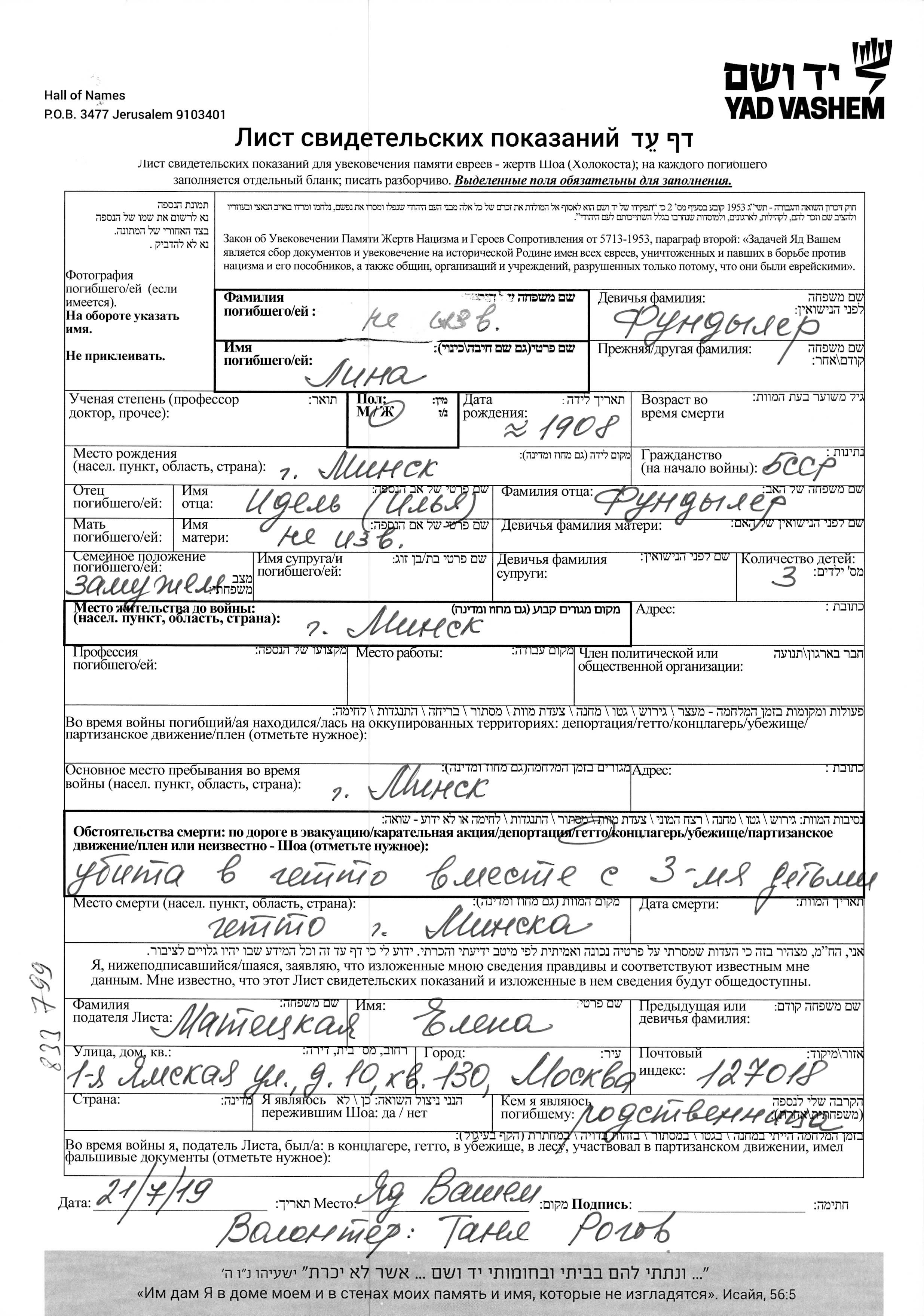 nom inconnu Lina 1908 Minsk, Bélorussie (URSS) Feuille de témoignage