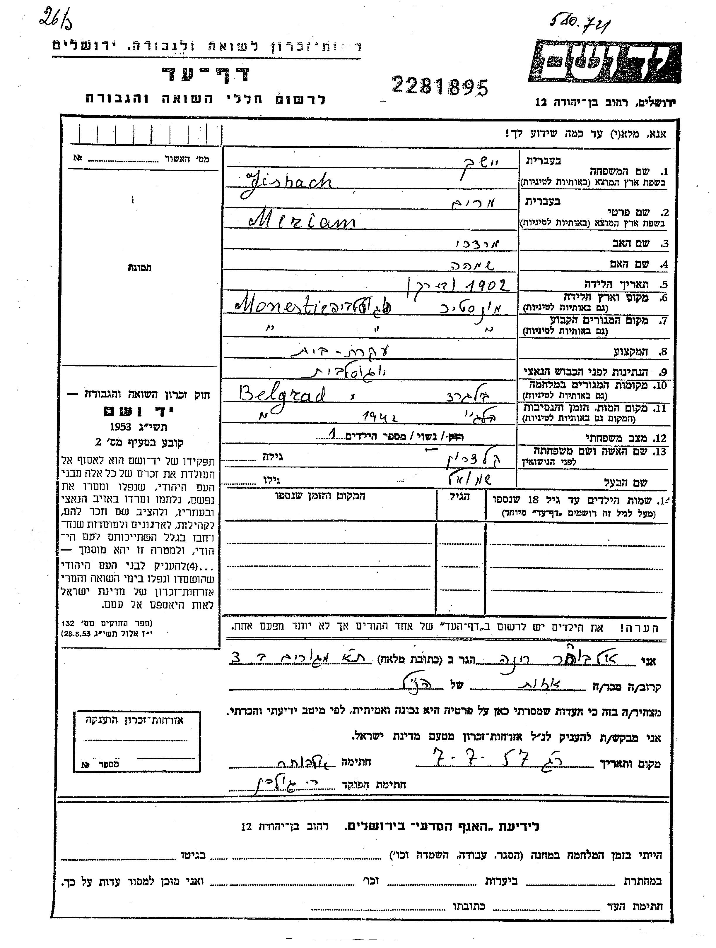 Jishach Miriam 1902 Monastir, Yugoslavie Feuille de témoignage