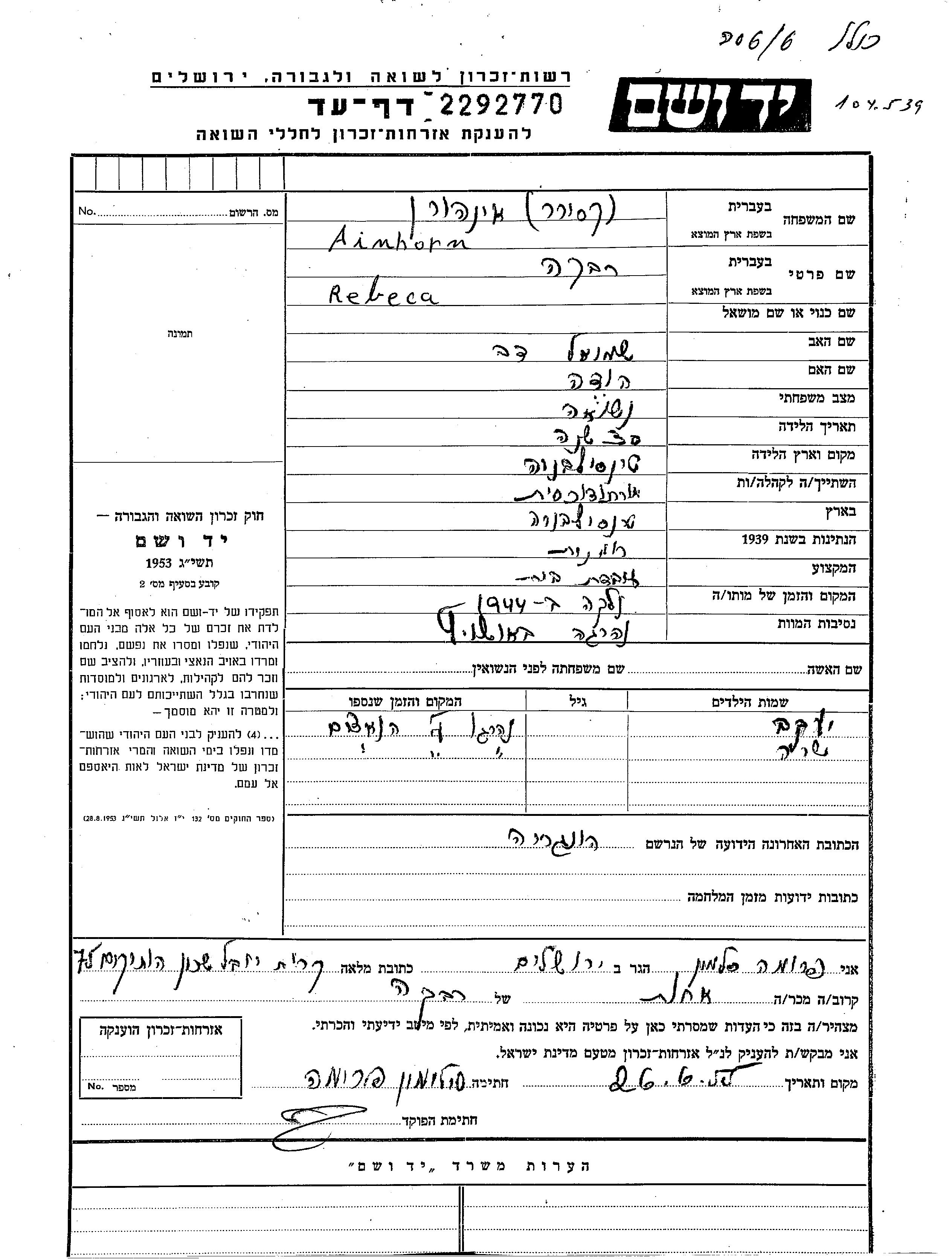 Yad Vashem - Pages of Testimony Names Memorial Collection