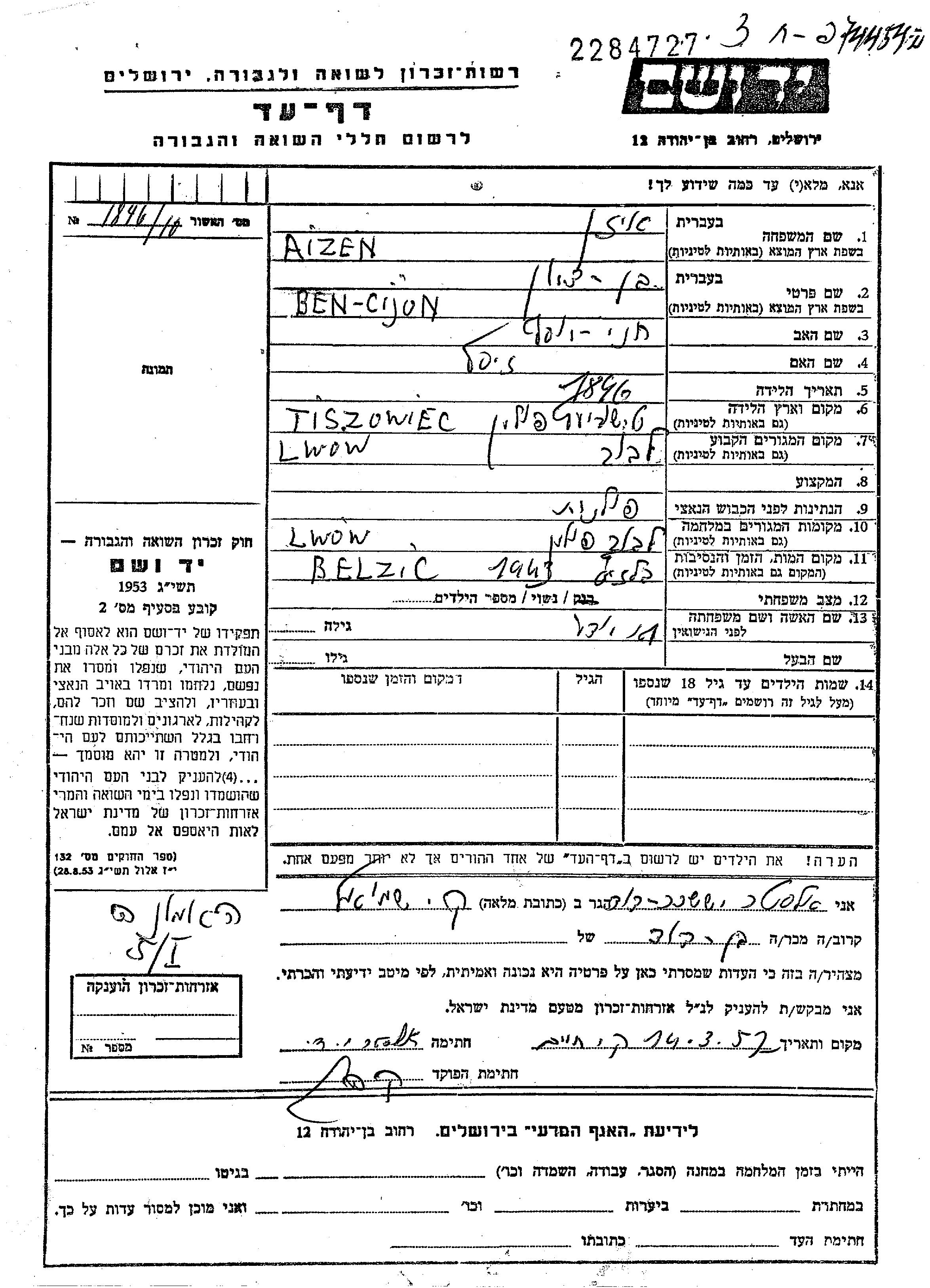 Aizen Ben Cijon 1896 Lwow, Pologne Feuille de témoignage