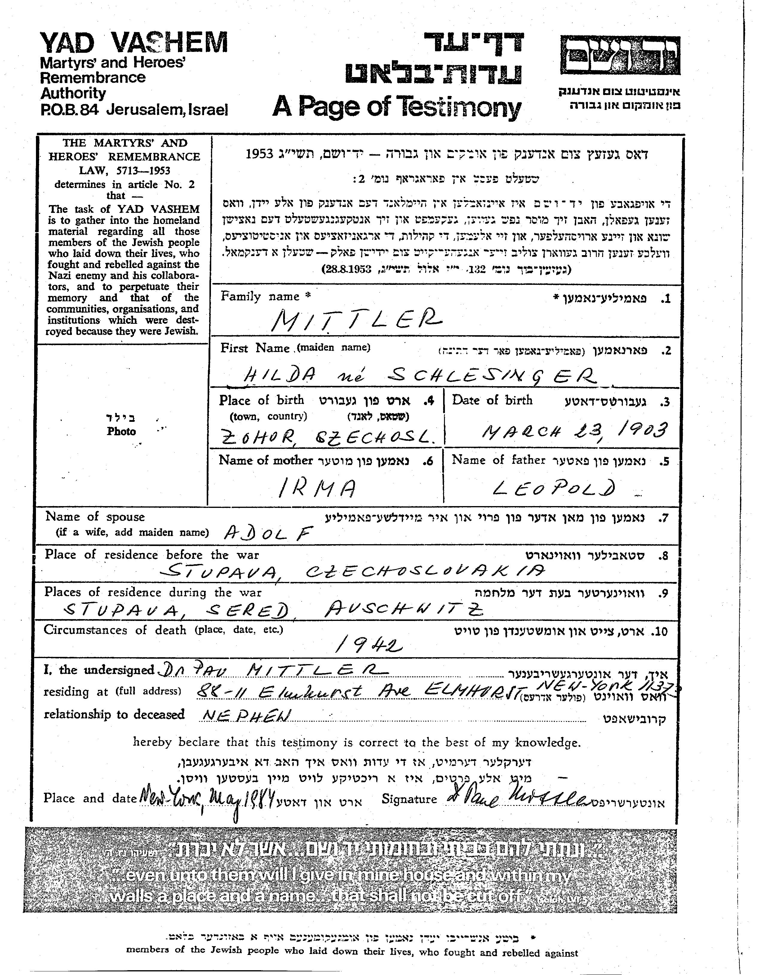 Mittler | Hilda | Stupava, Tchécoslovaquie | Feuille de témoignage | |