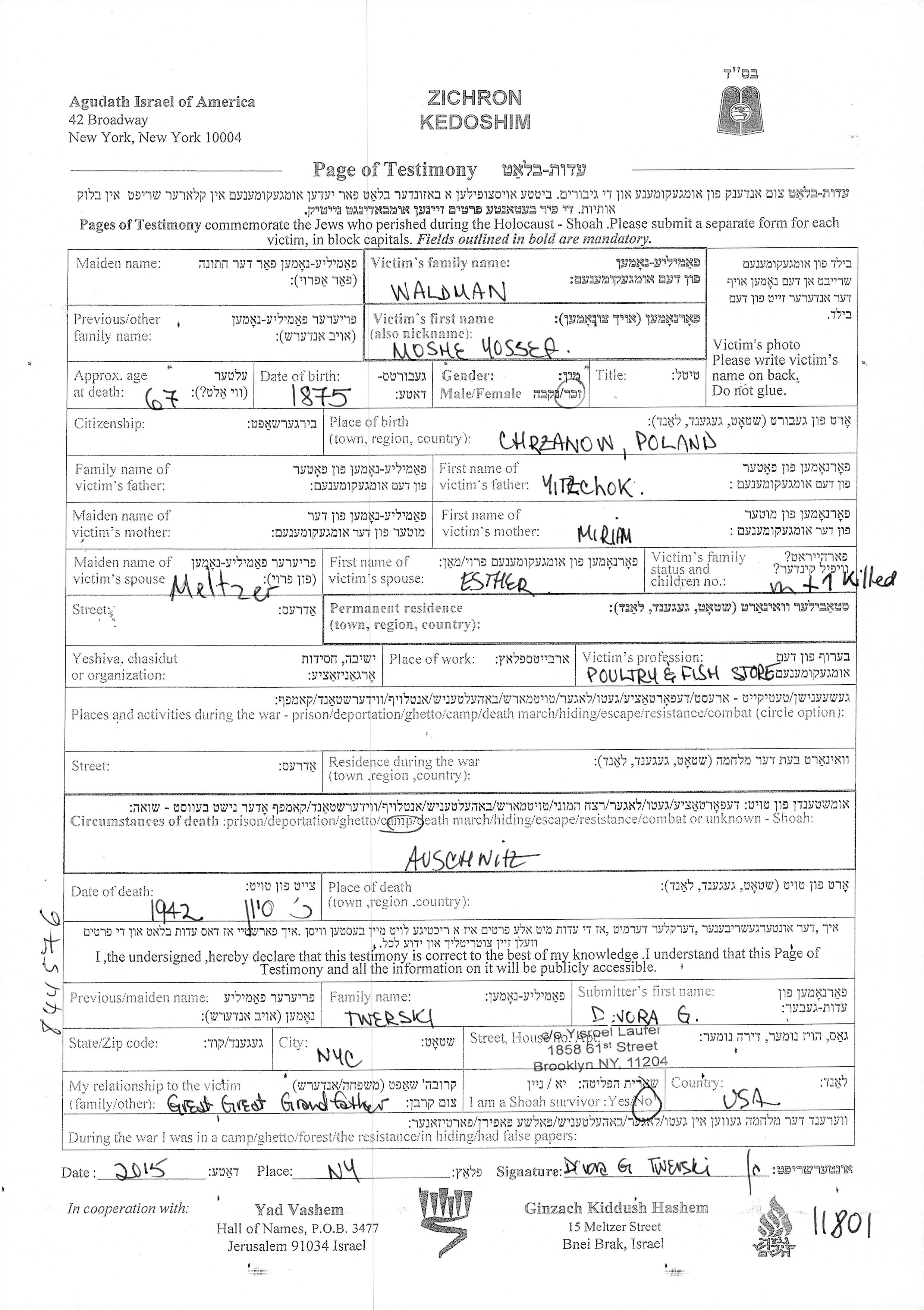 Moshe Yossef Waldman est né à Chrzanow, Pologne en 1875, fils de Yitzchok et de Miriam. Il était סוחר דגים ועופות et Mariée à Esther née Meltzer. Au cours de la guerre, il était à Auschwitz, Pologne.