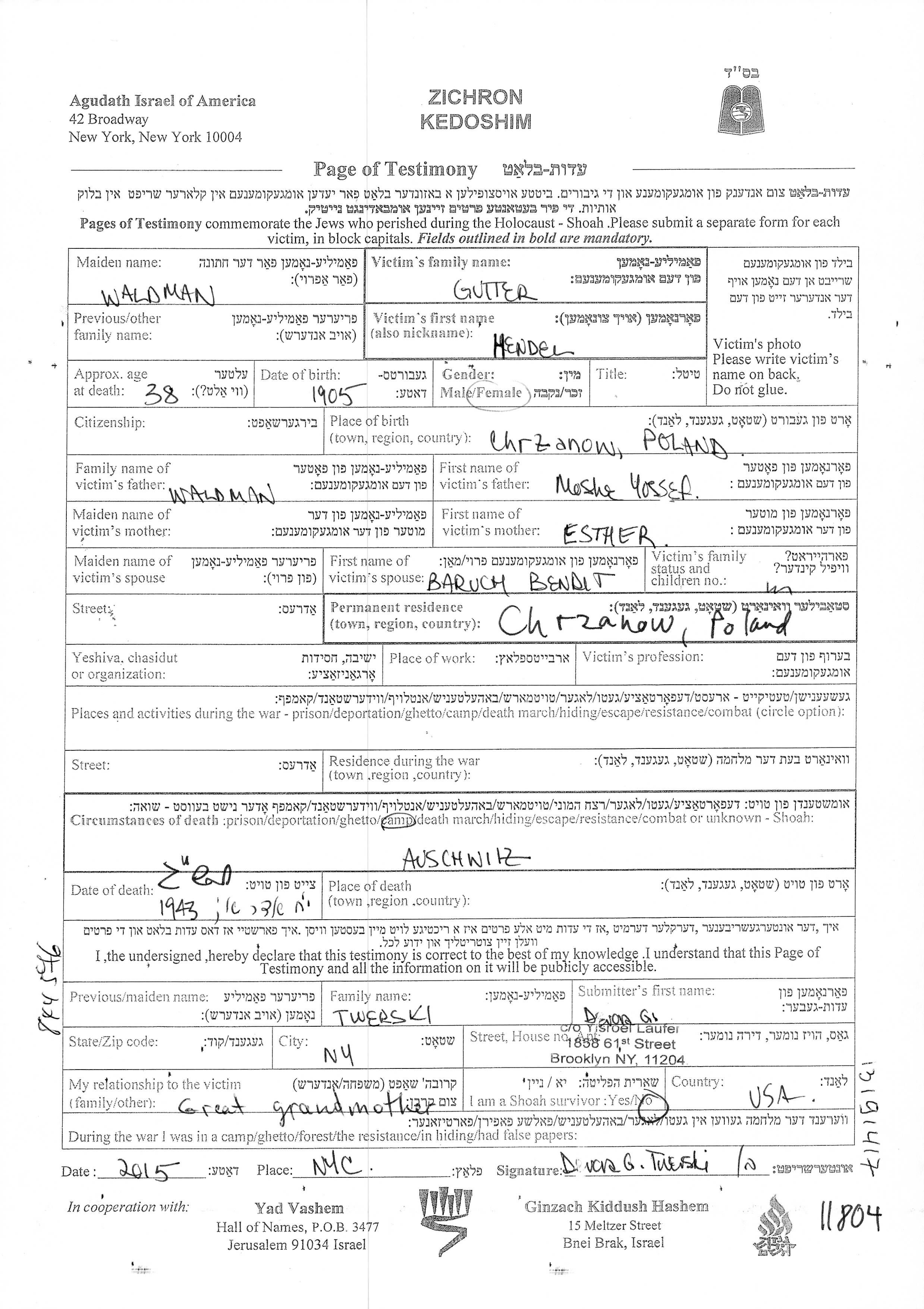 Hendel Gutter née Waldman est née à Chrzanow, Pologne en 1905, fille de Moshe Yossef et de Esther. Elle était Mariée à Baruch Bendit. Avant la seconde guerre mondiale elle vivait à Chrzanow, Pologne.