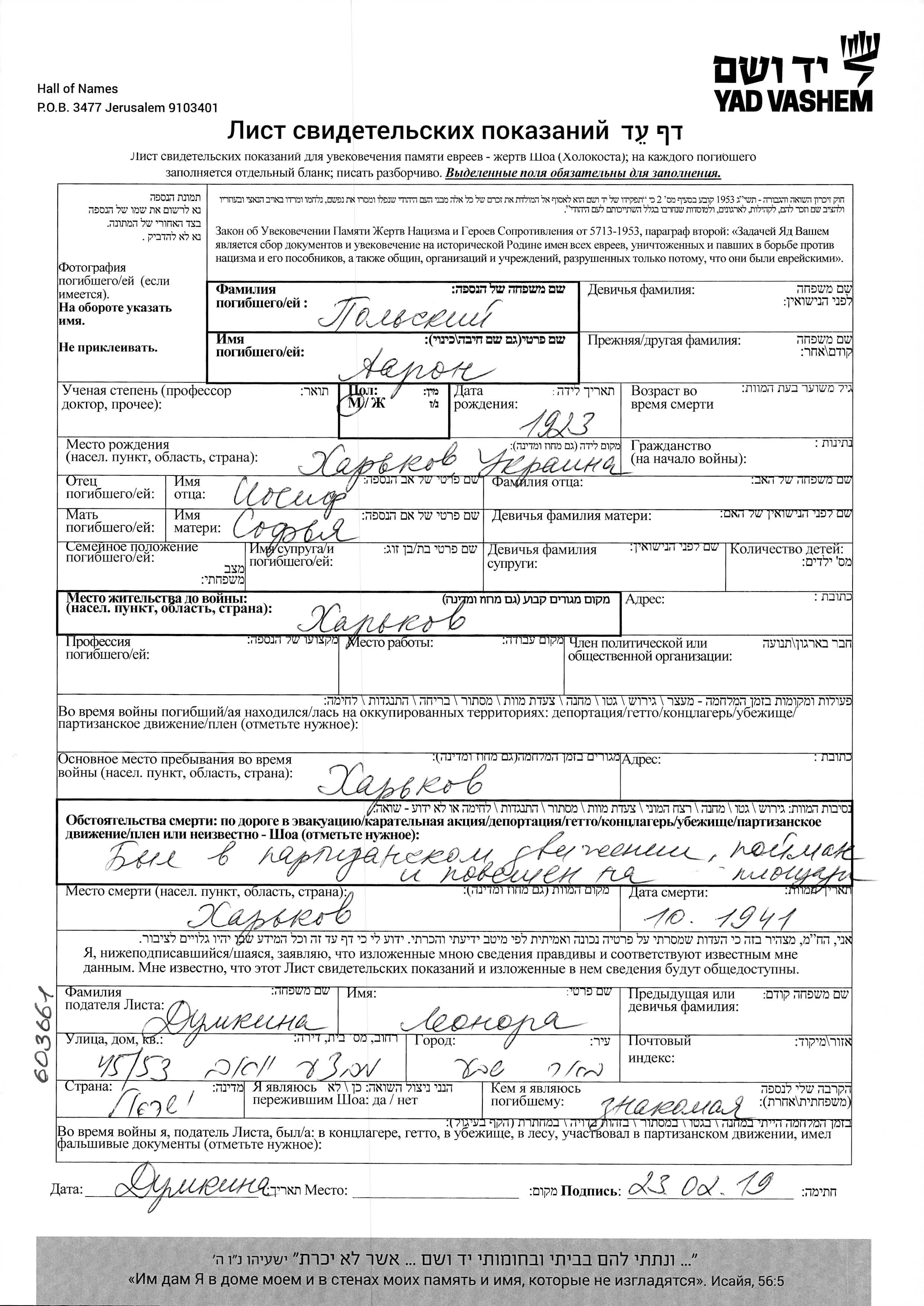 Polskiy Aaron 1923 Kharkov, Ukraine (URSS) Feuille de témoignage