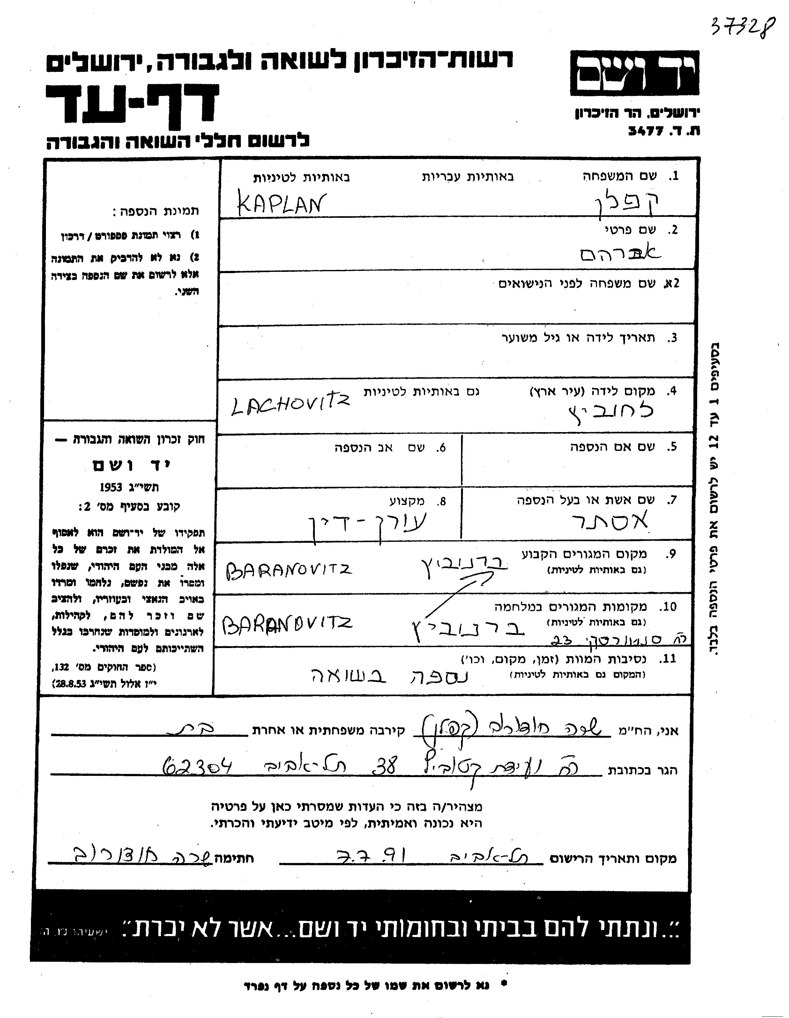 Kaplan Abraham Baranowicze, Pologne Feuille de témoignage