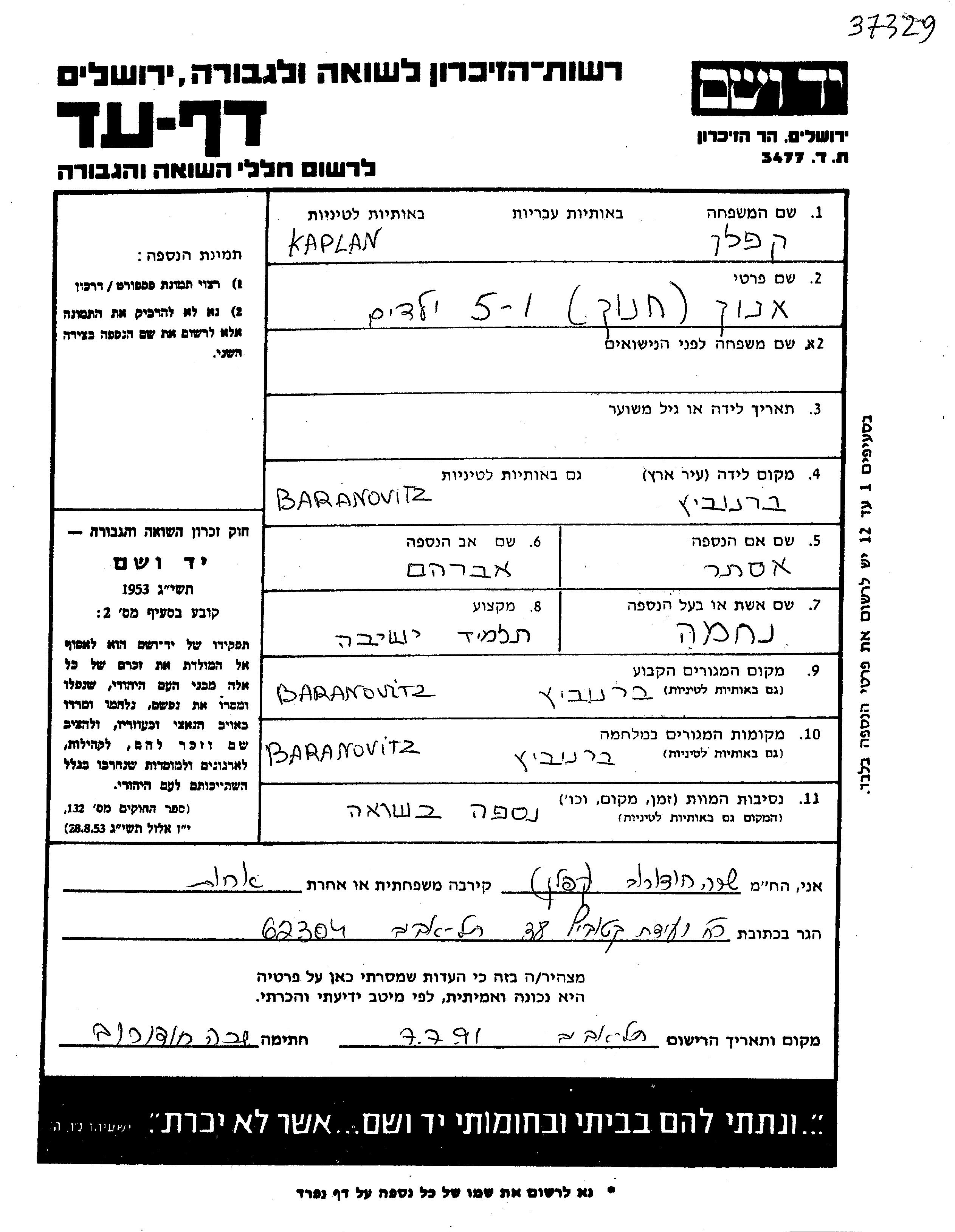 Kaplan Chanoch 1892 Baranowicz, Pologne Feuille de témoignage