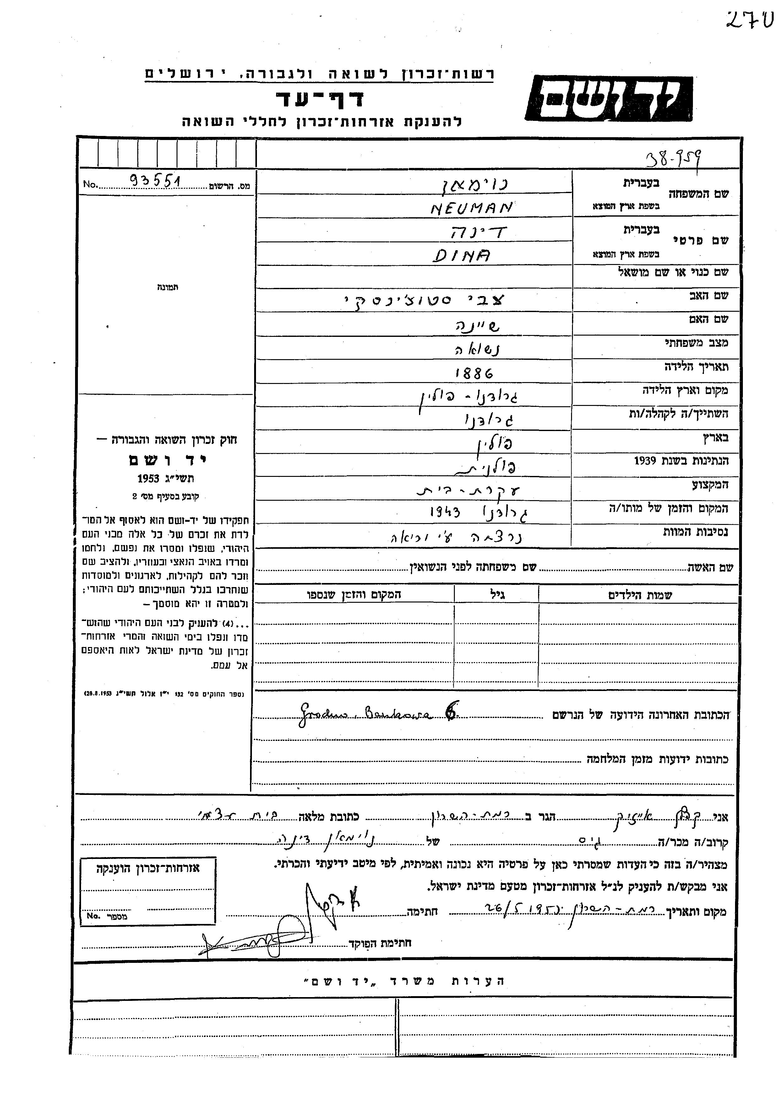 Neuman Dina 1886 Grodno, Pologne Feuille de témoignage
