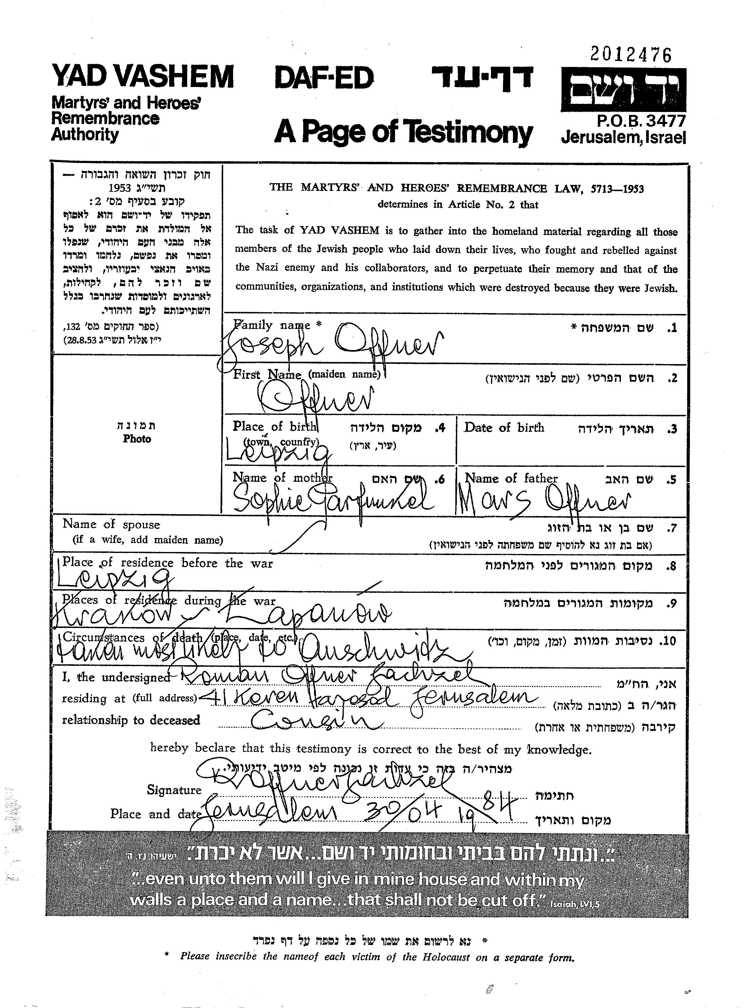 Yoseph Offner est né à Leipzig, Allemagne, fils de Mark et de Sophie née Garfunkel. Avant la seconde guerre mondiale il vivait à Leipzig, Allemagne. Au cours de la guerre, il était à Lapanow, Pologne.
