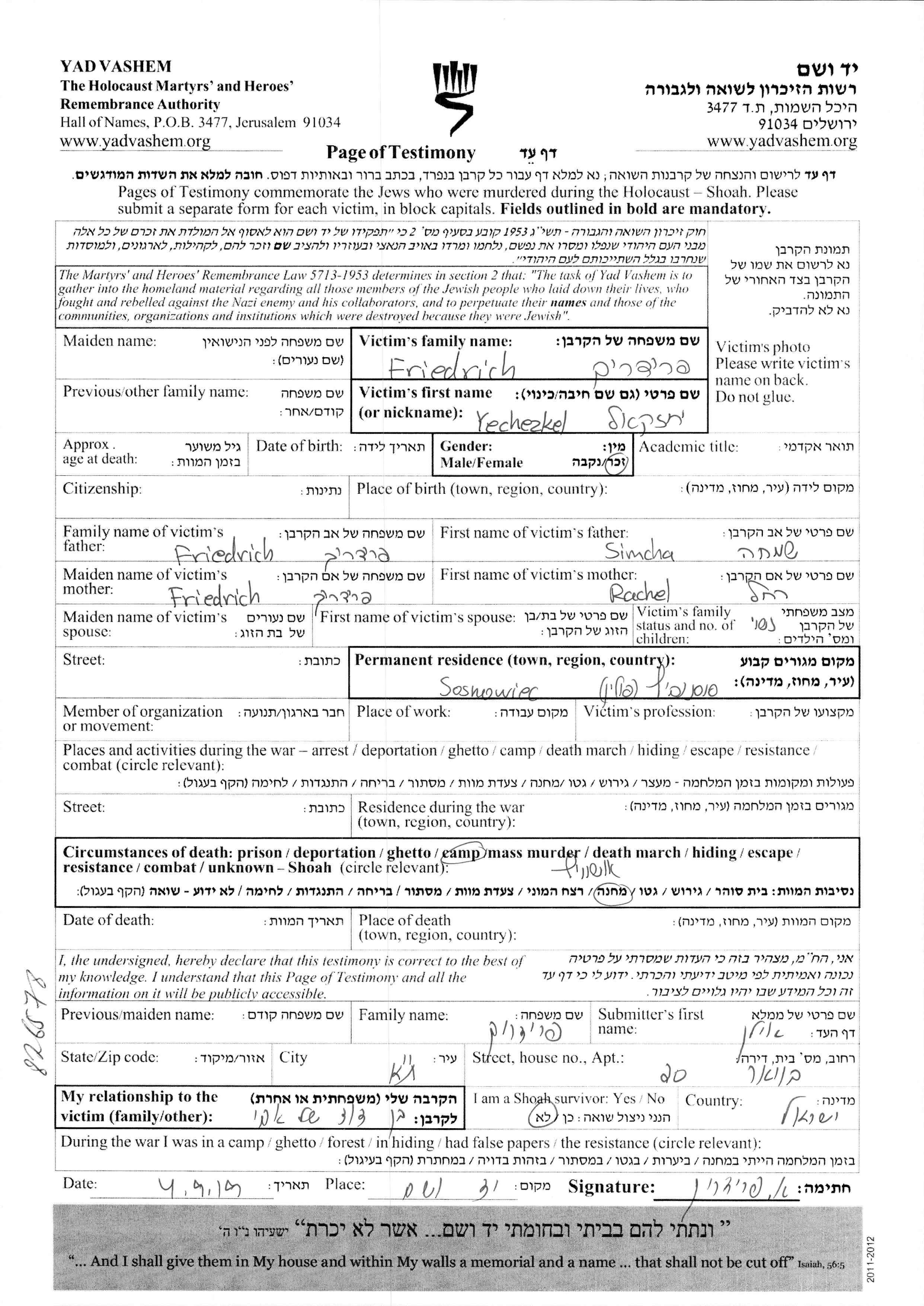 Friedrich Yechezkel Sosnowiec, Pologne Feuille de témoignage