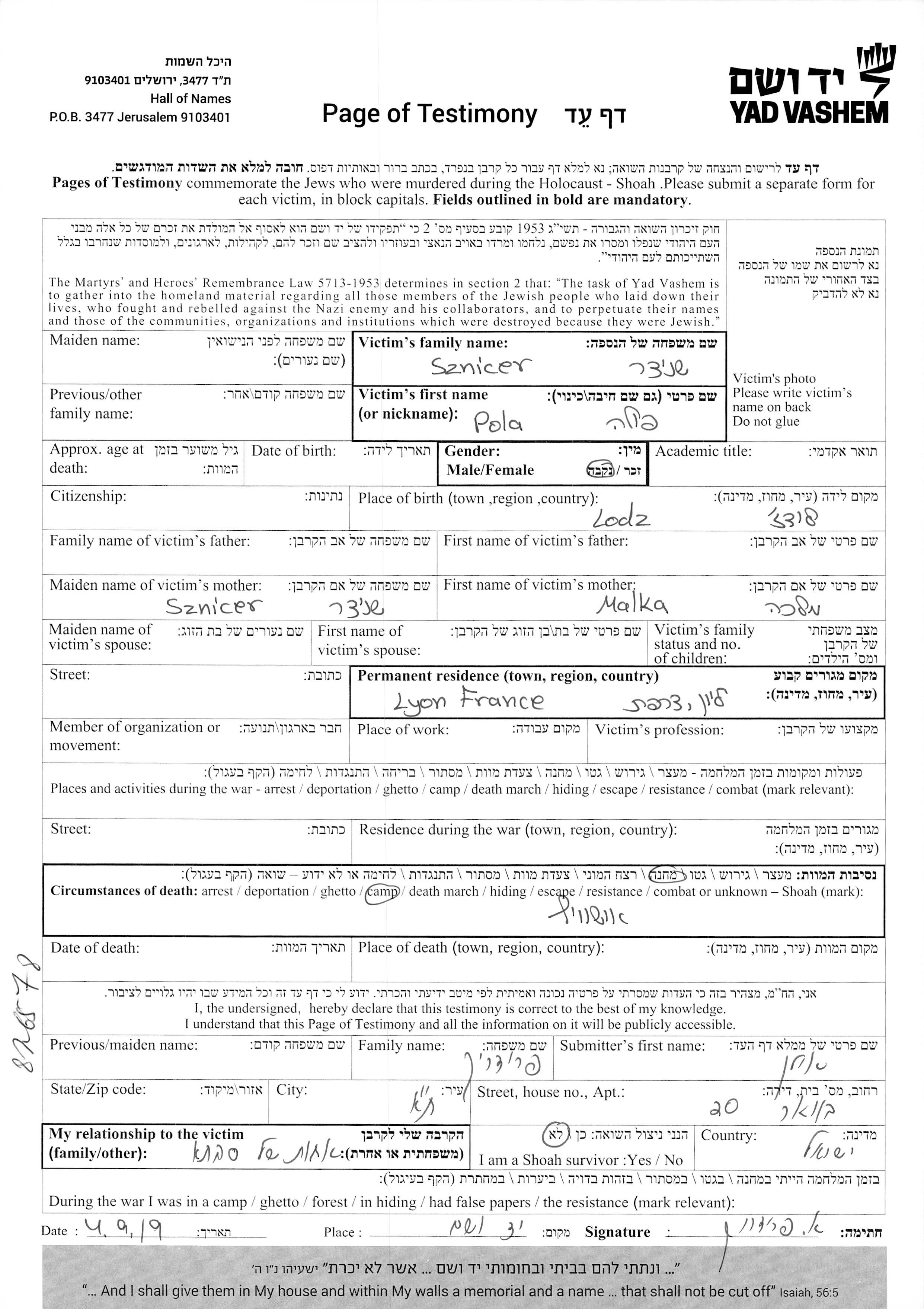 Pola Sznicer est née à Lodz, Pologne. Avant la seconde guerre mondiale elle vivait à Lyon, France.