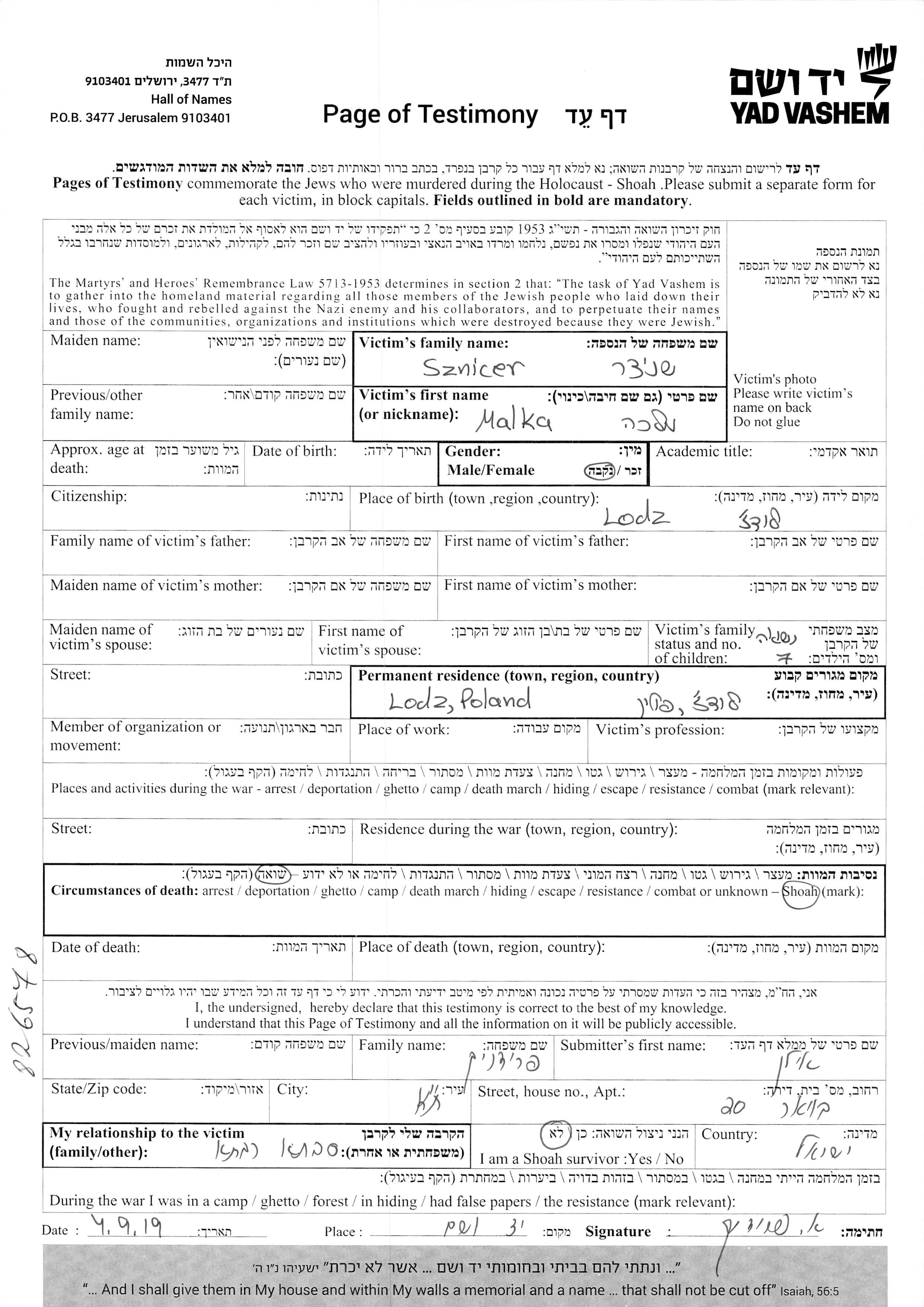 Sznicer Malka Lodz, Pologne Feuille de témoignage