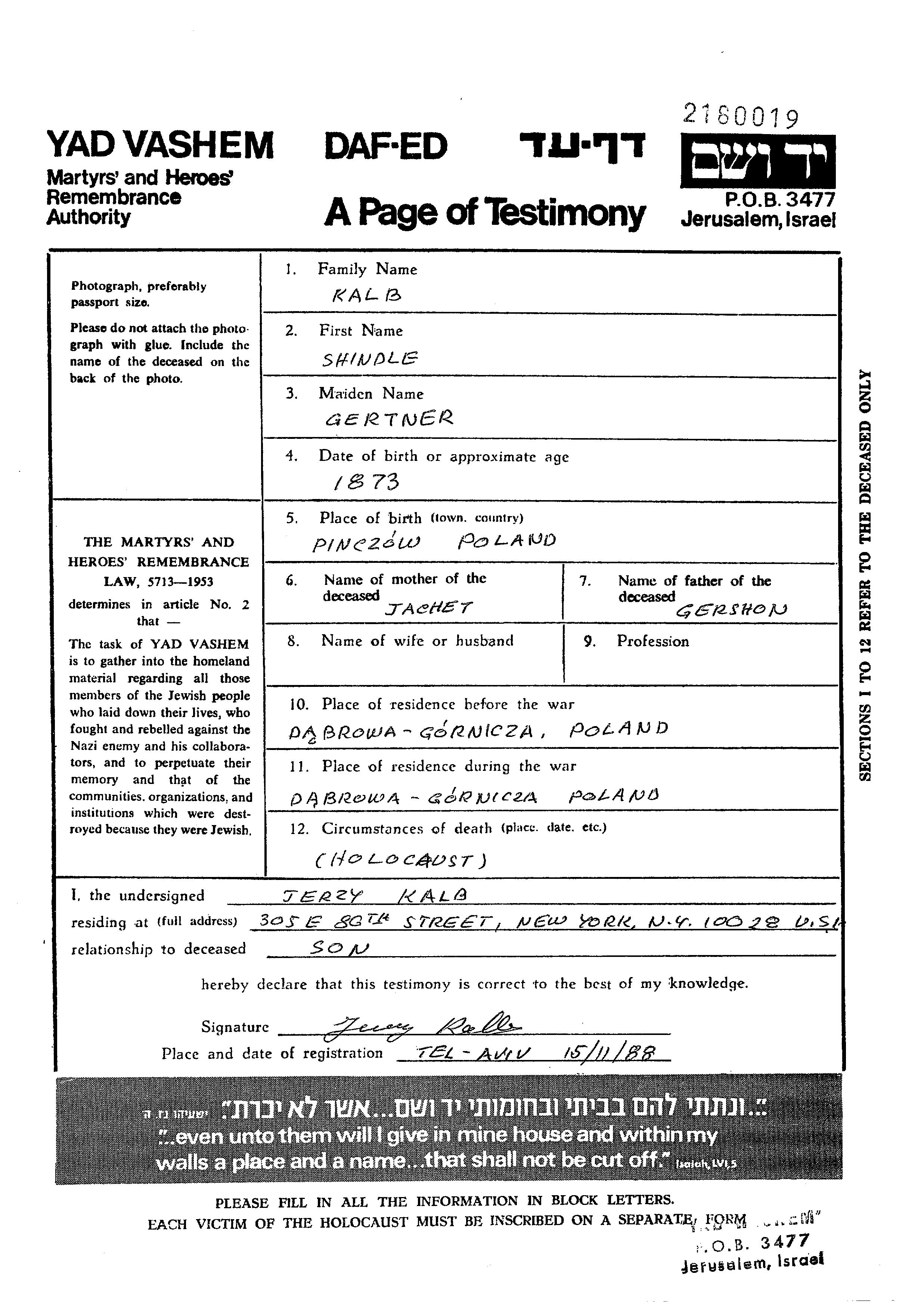 Kalb | Sheindel | Dabrowa Gornicza, Pologne | Feuille de témoignage |