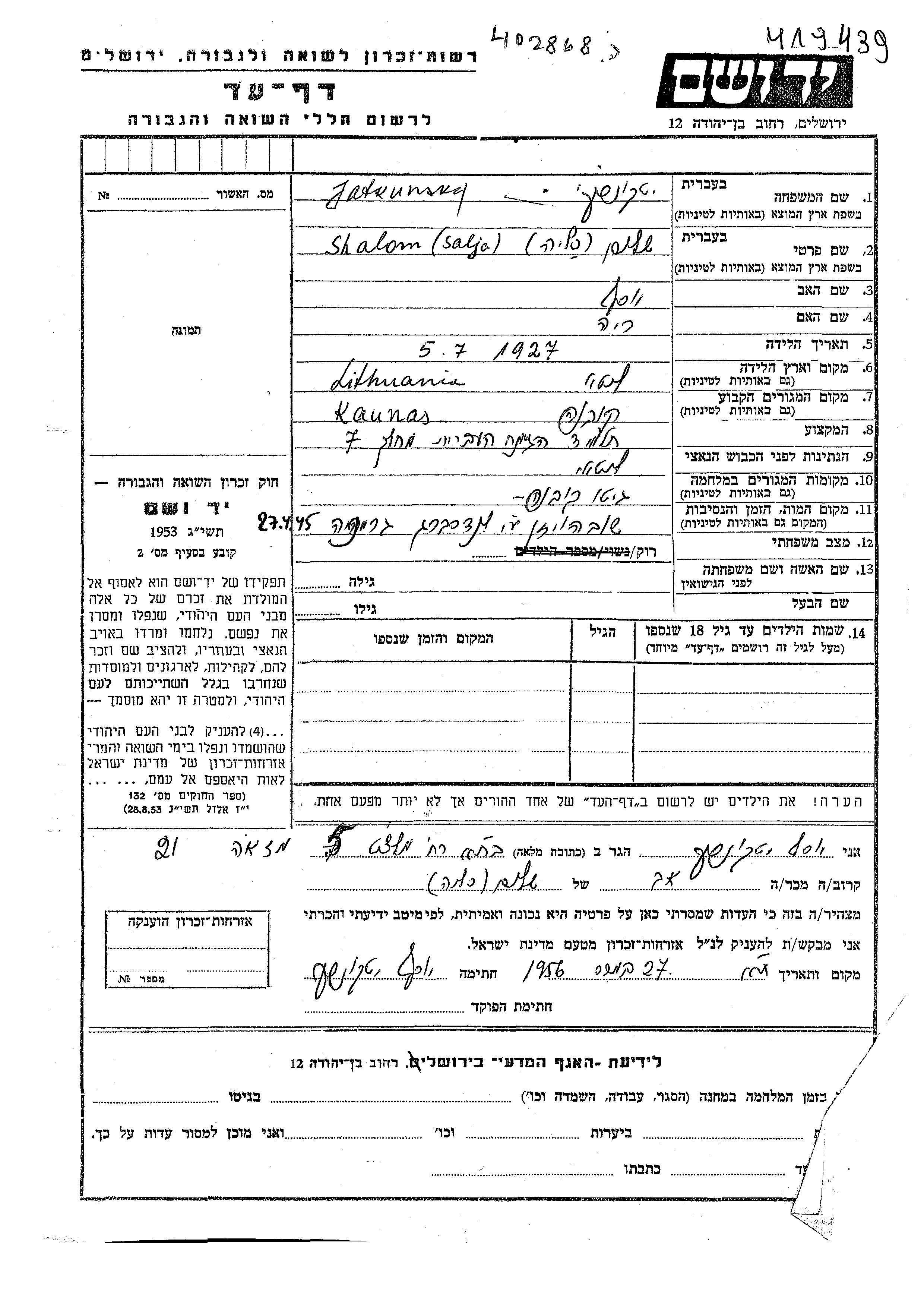 Yatkunski Salia Shalom 1927 Kaunas, Lituanie Feuille de témoignage