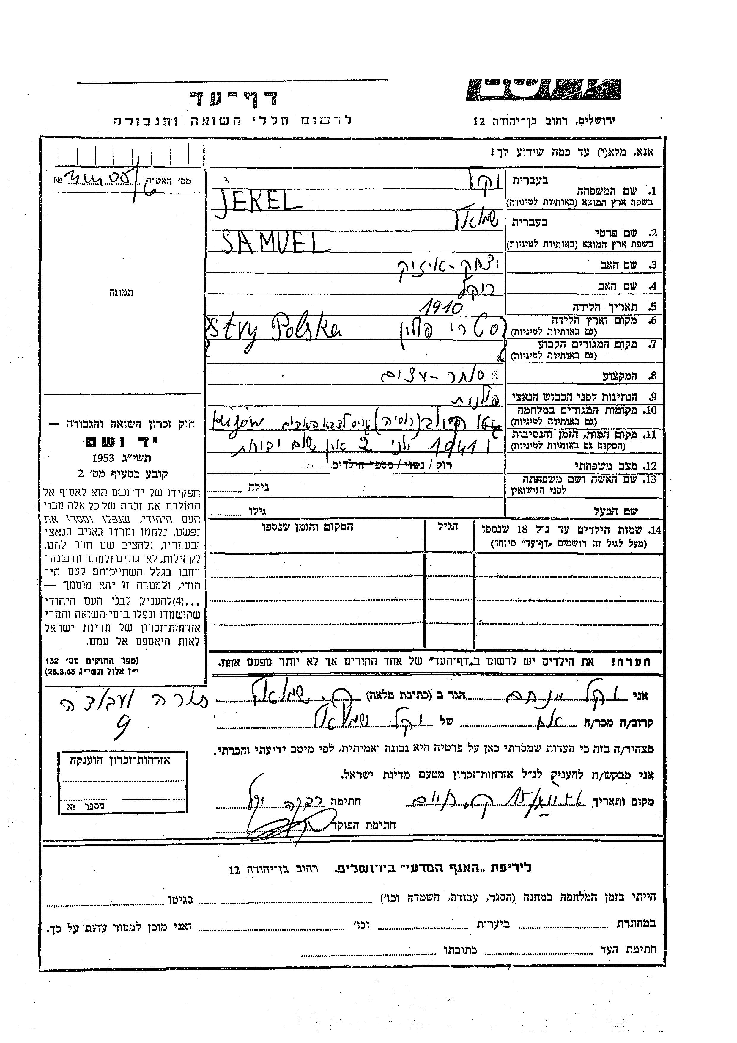 Shmuel Jekel est né à Stry, Pologne en 1910. Il était Négociant en bois. Avant la seconde guerre mondiale il vivait à Stryj, Pologne.