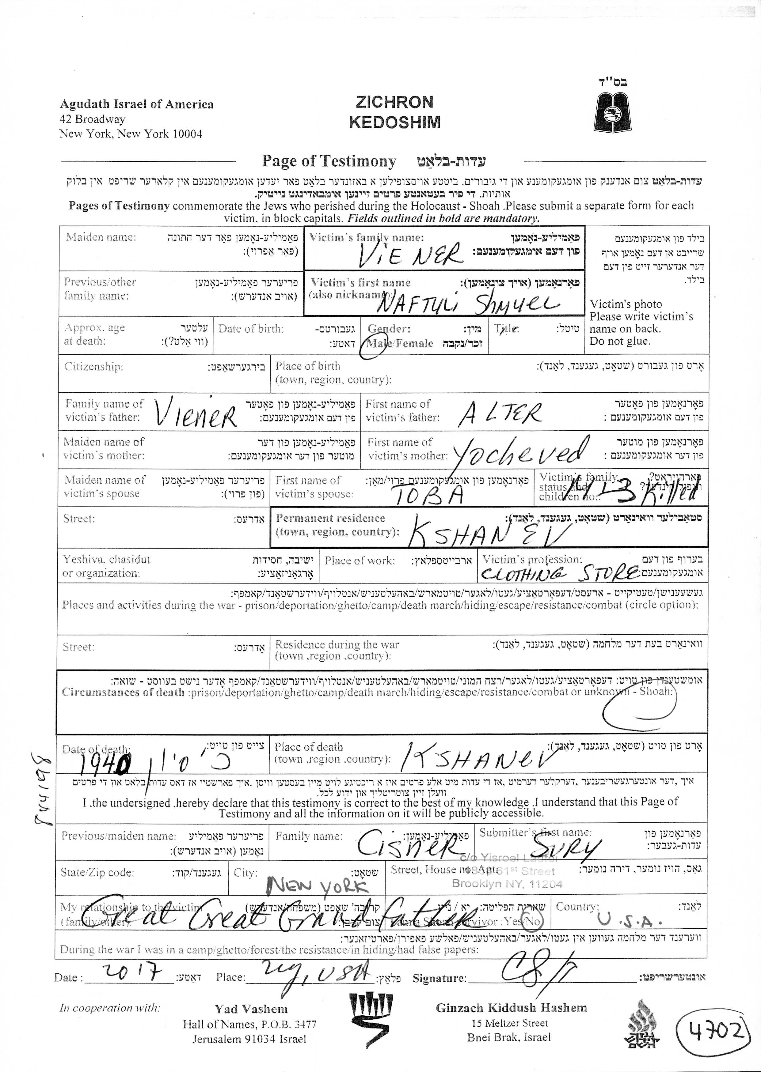 Naftuli Shmuel Viener est né fils de Alter et de Yocheved. Il était Mariée à Toba. Avant la seconde guerre mondiale il vivait à Kshanov, Pologne. Au cours de la guerre, il était à Kshanov, Pologne.