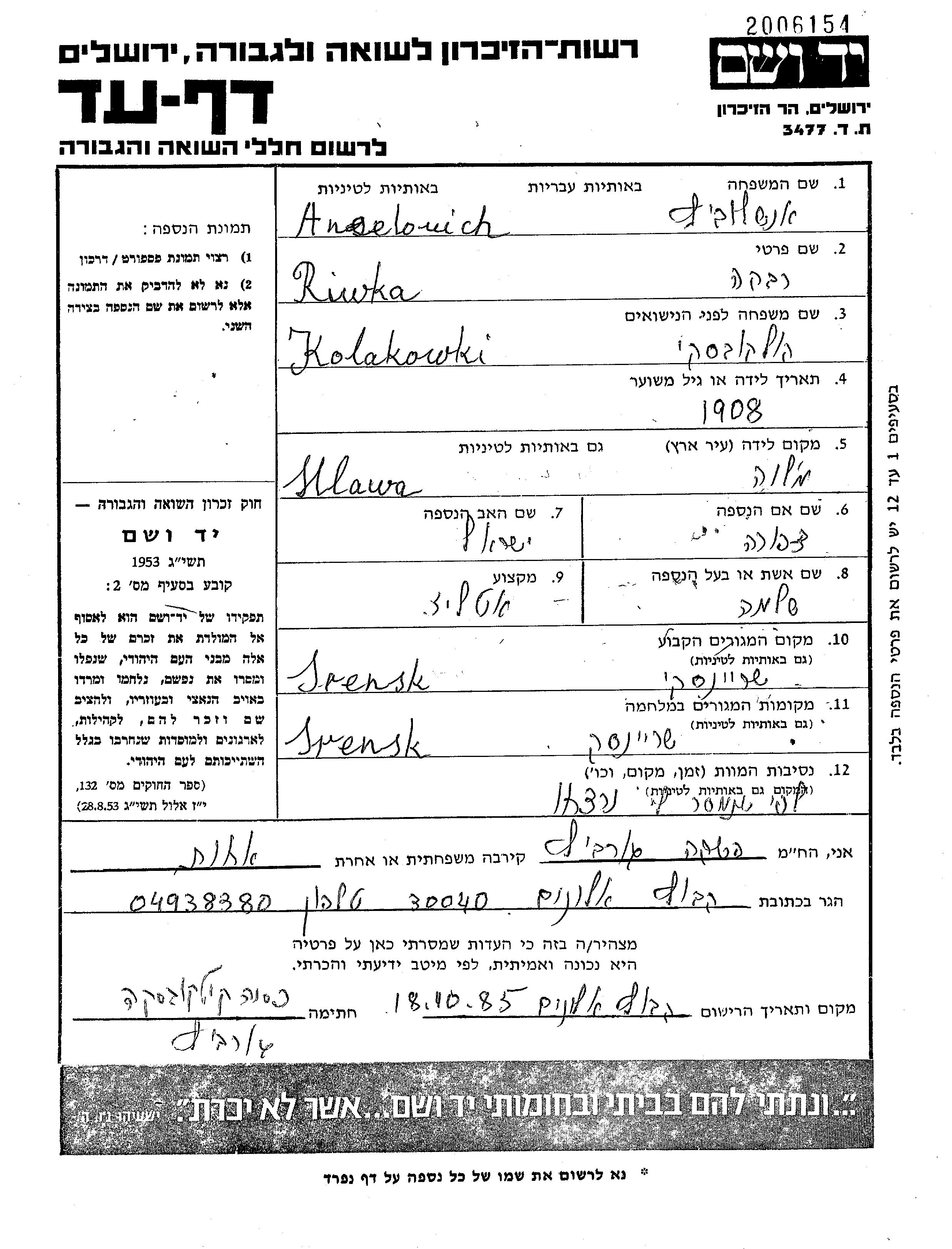 Anselovich Riwka 1908 Szrensk, Pologne Feuille de témoignage
