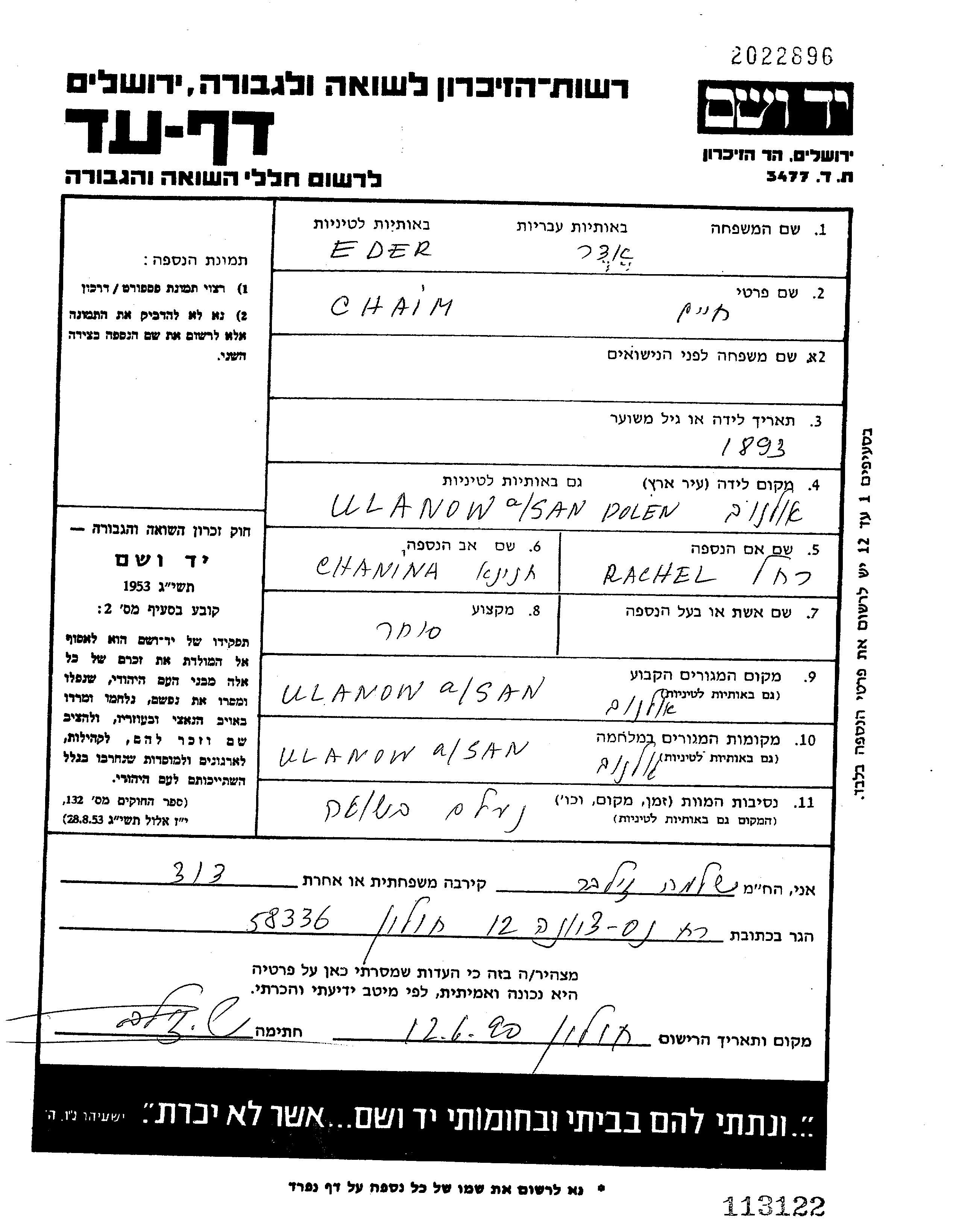 Eder Chaim 1893 Ulanow, Pologne Feuille de témoignage