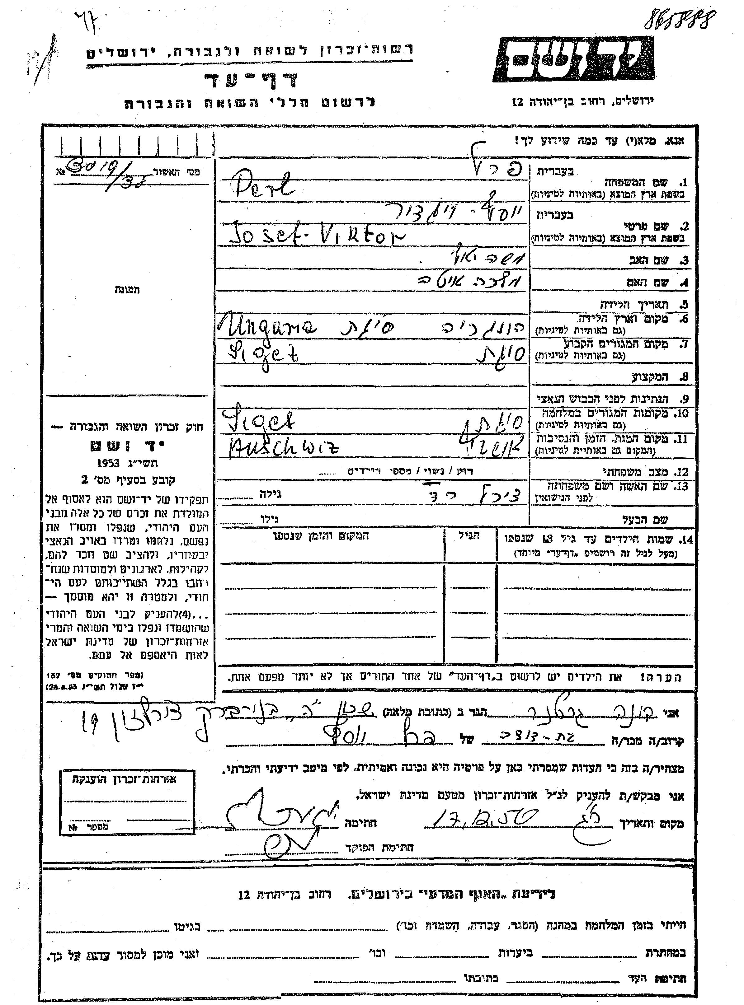 | Perl | Josef Vigtor Viktor | Siget, Roumanie | Feuille de témoignage | |