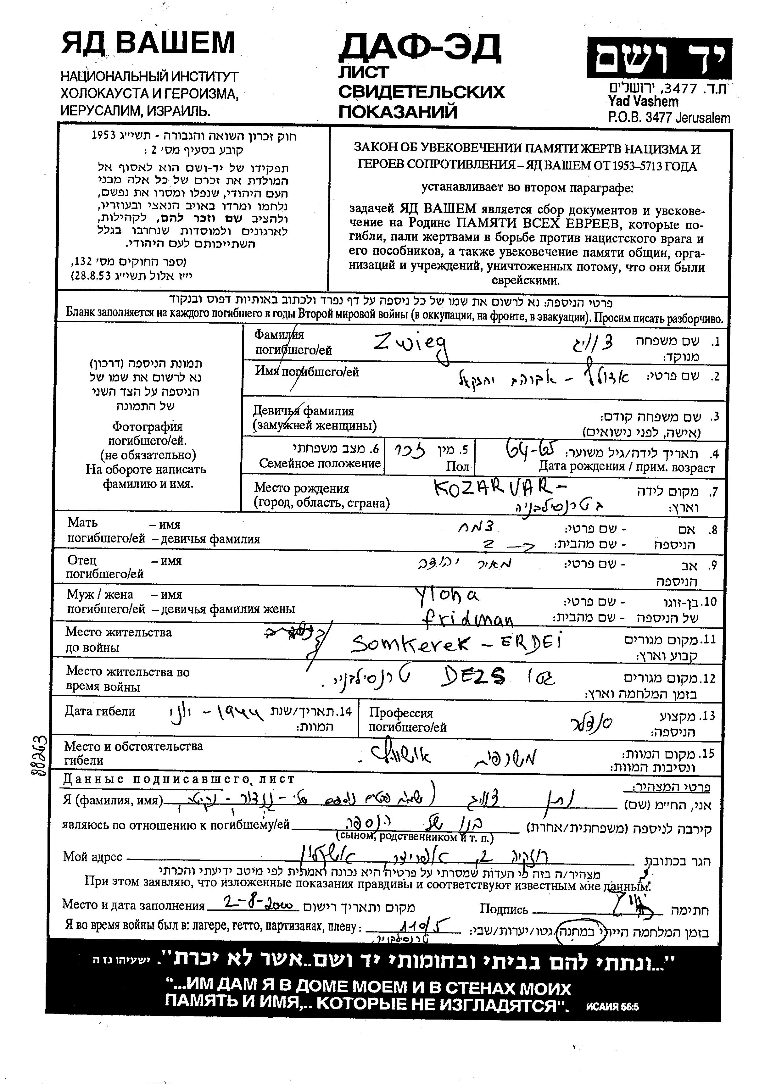 Zweig | Adolf Avraham Yekhezkel | Somkerek, Roumanie | Feuille de témoignage | |